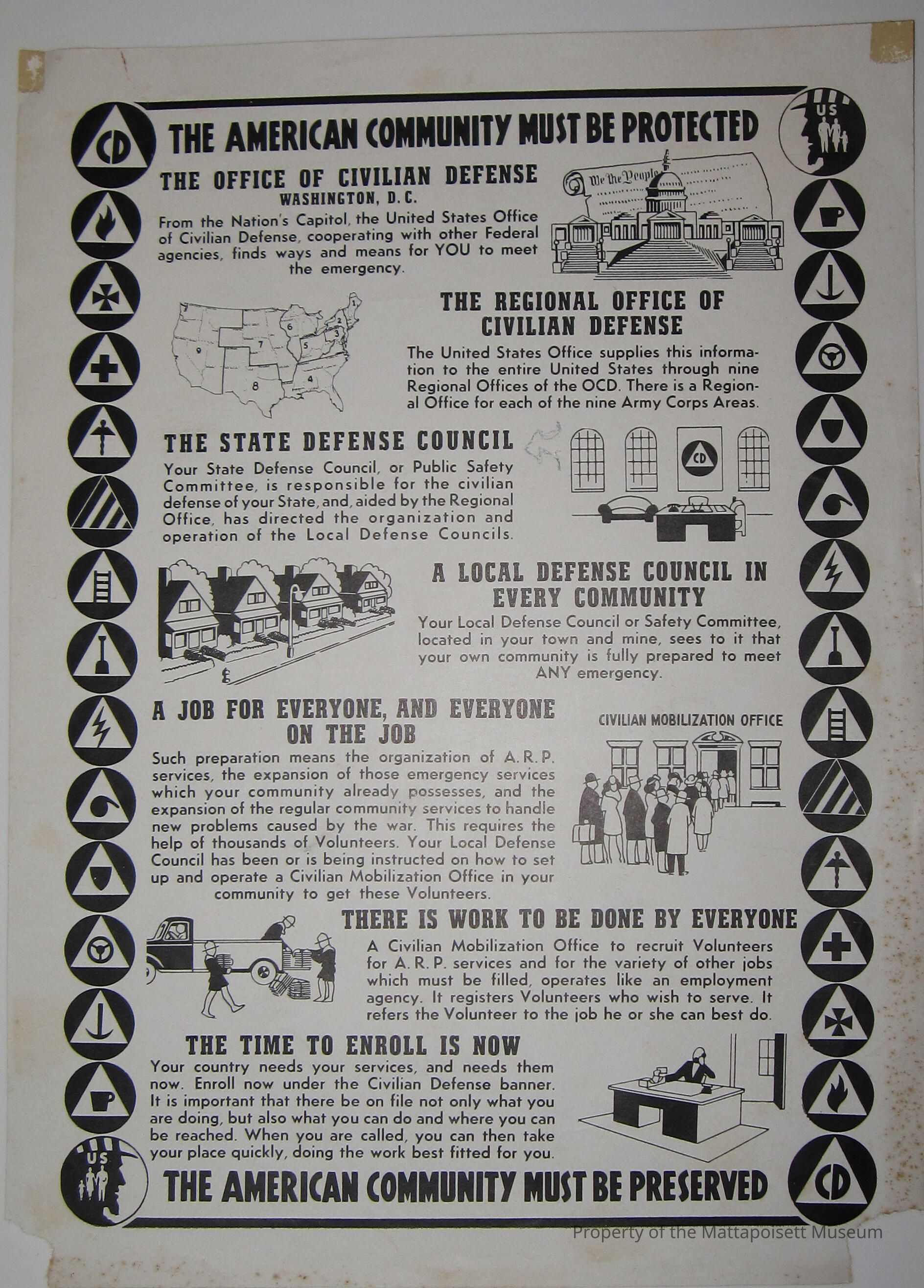 The American Community Must be Protected/The American Community must be Preserved. Pamphlet/poster for the Office of Civilian Defense. From the Nation’s Capitol, the United States Office of Civilian Defense, cooperating with other Federal agencies, funds ways and means for YOU to meet the emergency.Collection