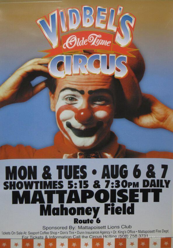 Poster for Vidbel's Olde Tyme Circus. Monday and Tuesday, August 6 & 7, showtimes 5:15pm and 7:30pm daily. Mattapoisett, Mahoney Field, Route 6. Sponsored by Mattapoisett Lion's Club.Collection