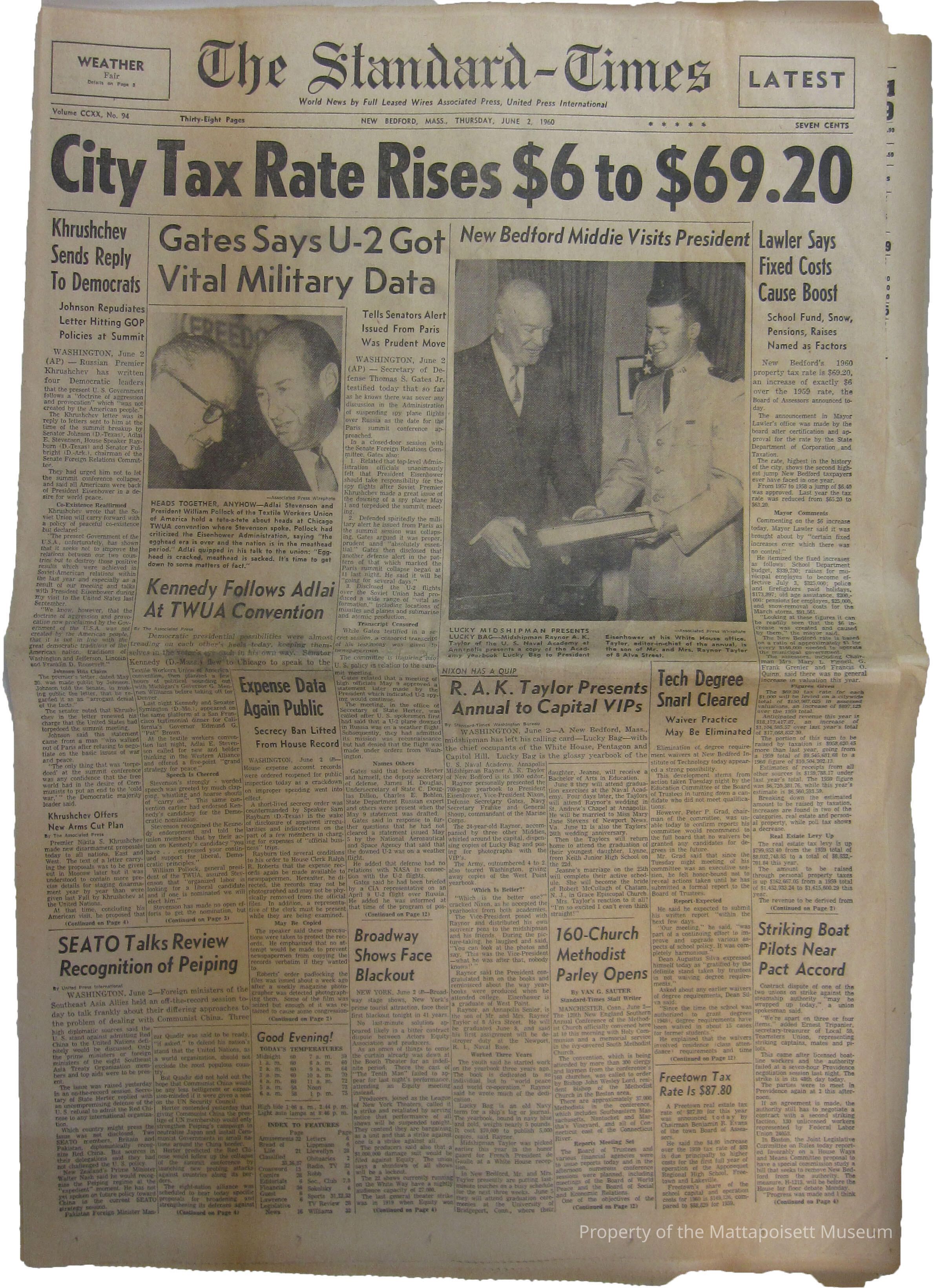 The Standard-Times. Vol. CCXX, No. 94. New Bedford, Mass, Thursday, June 2, 1960. Thirty-eight pages, two sections, some pages are missing.Collection