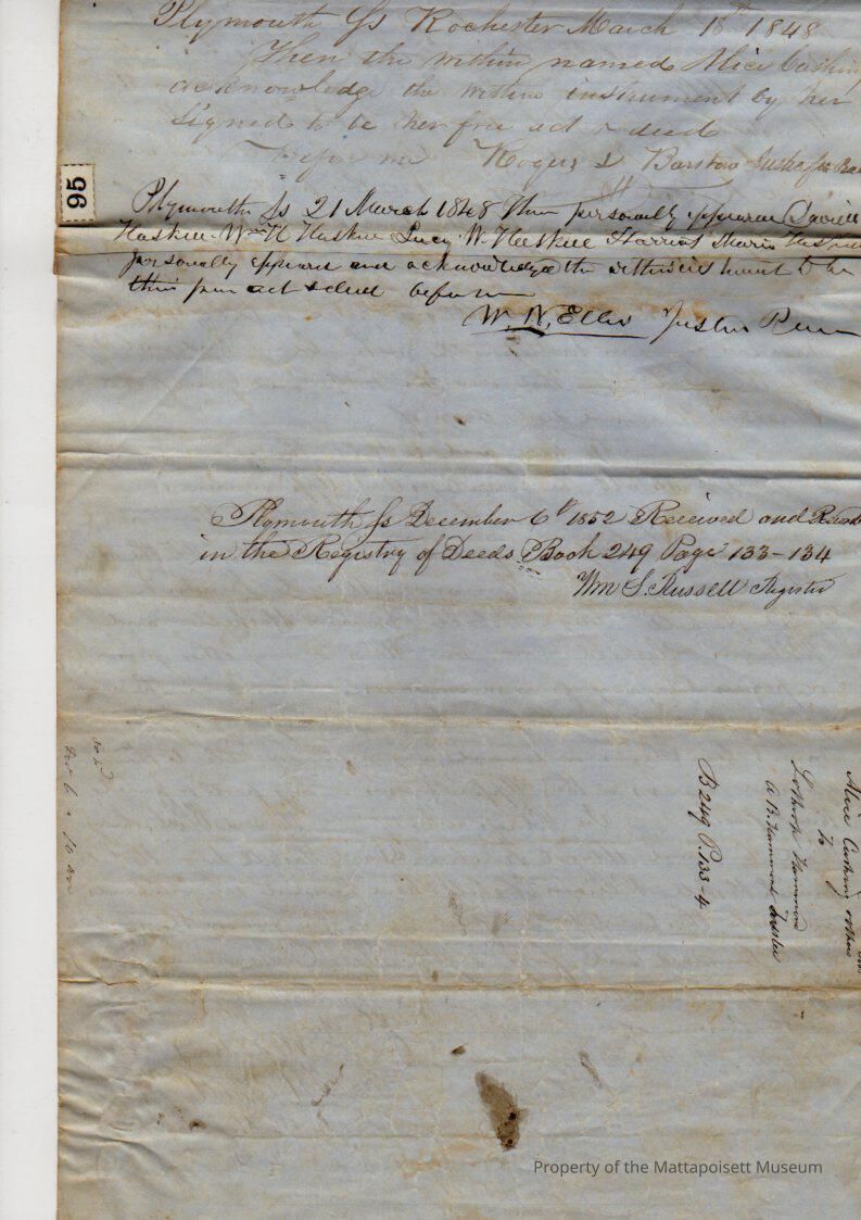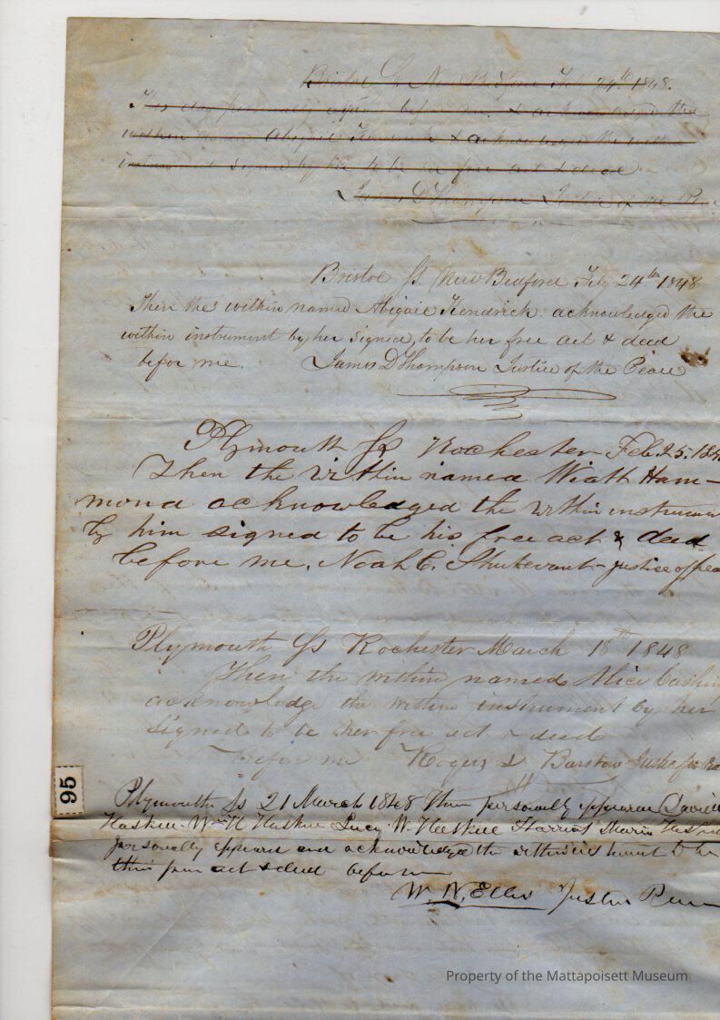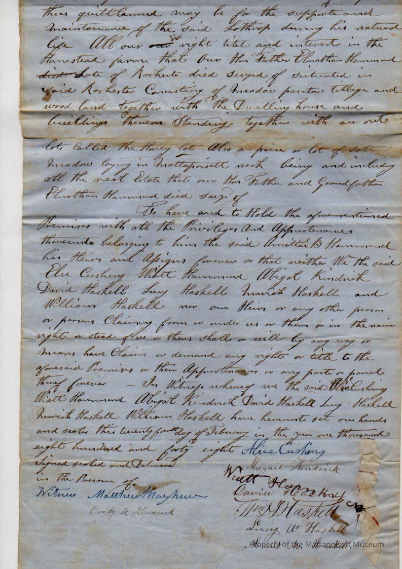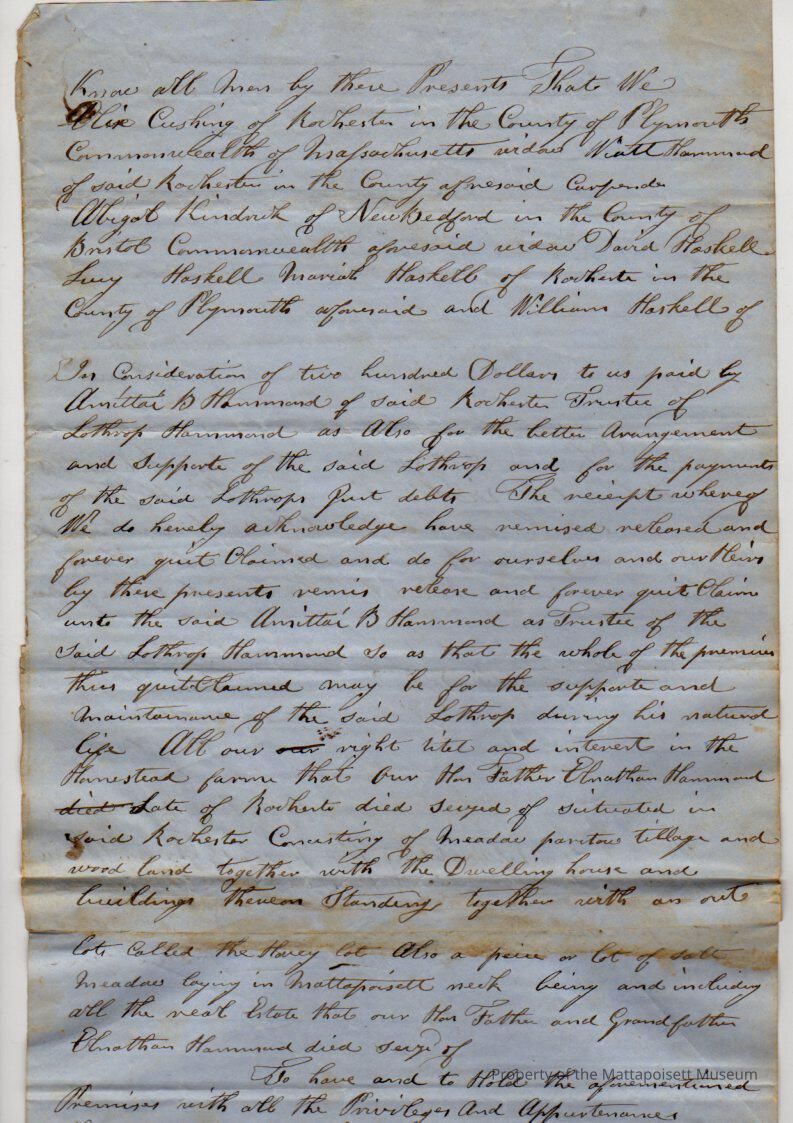 Alice Cushing et al (Wiatt Hammond, Abigail Kendrick of New Bedford, widow, David, Lucy, Mariah & William Haskell) to & Amittai B. Hammond, trustee of Lothrop Hammond, for $200, book 249, page 133-134.Collection
