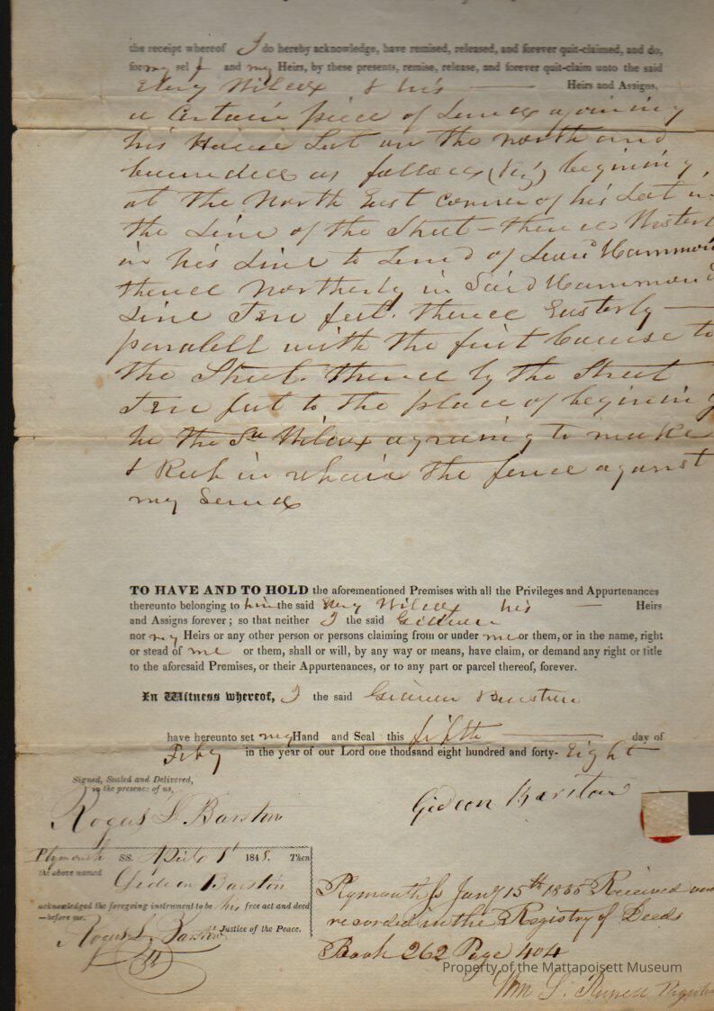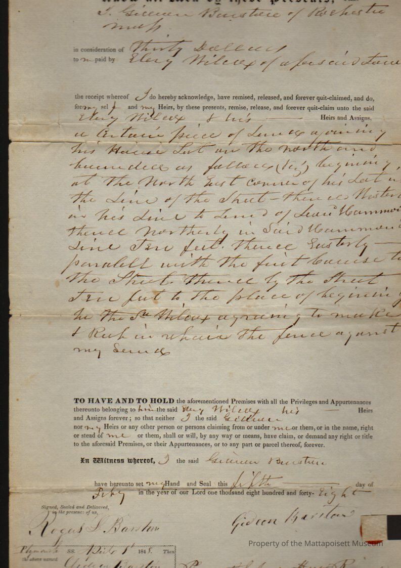 Gideon Barstow to Ebenezer Wilcox, land adjoining his house lot for $30, book 262, folio 404.Collection