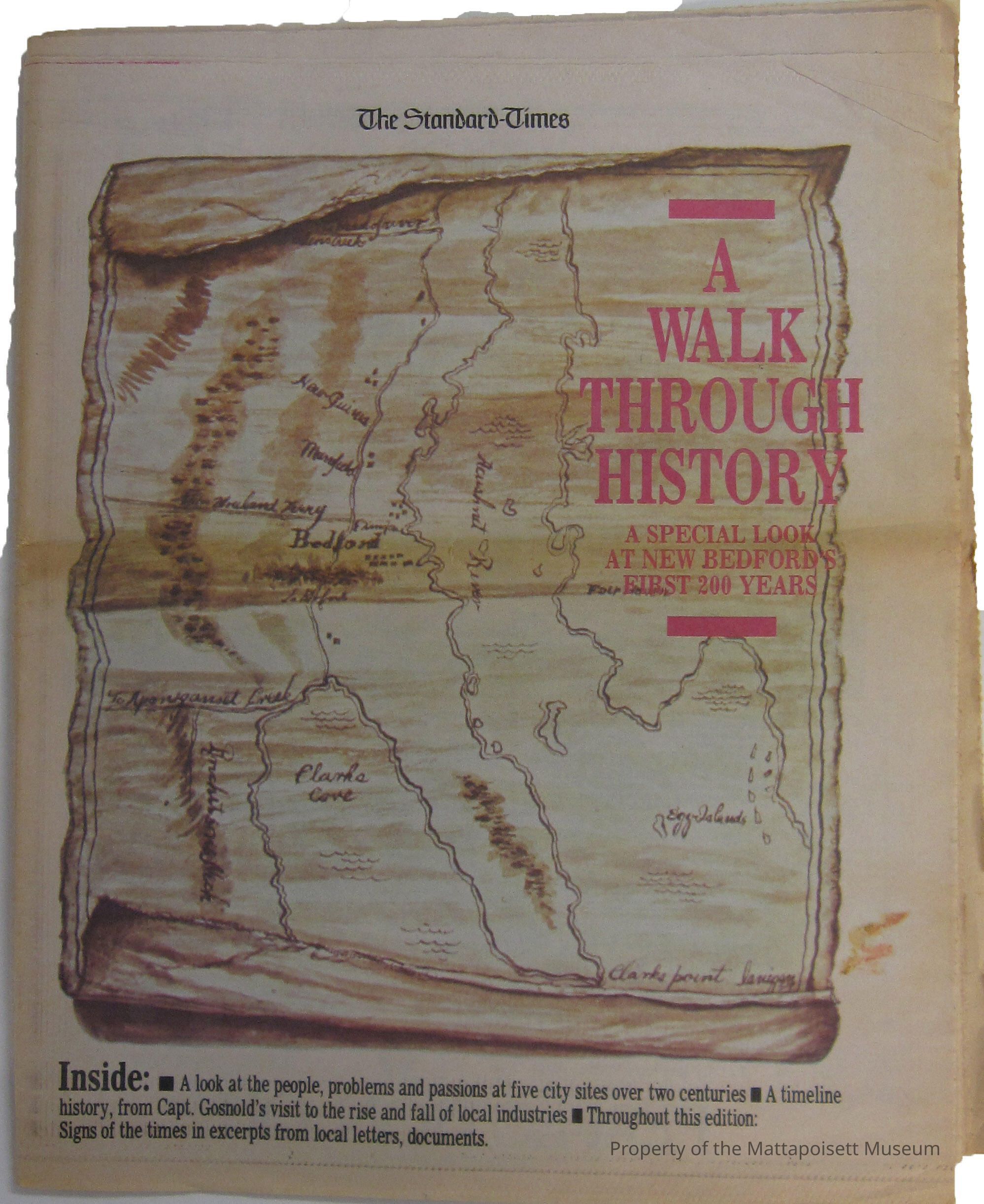 The Standard-Times, A Walk Through History. A special look at New Bedford’s first 200 years. New Bedford, MA, Friday July 3, 1987. A look at the people, problems and passions at five city sites over two centuries. A timeline history, from Capt. Gosnold’s visit to the rise and fall of local industries. Throughout this edition: Signs of the times in excerpts from local letters, documents.Collection