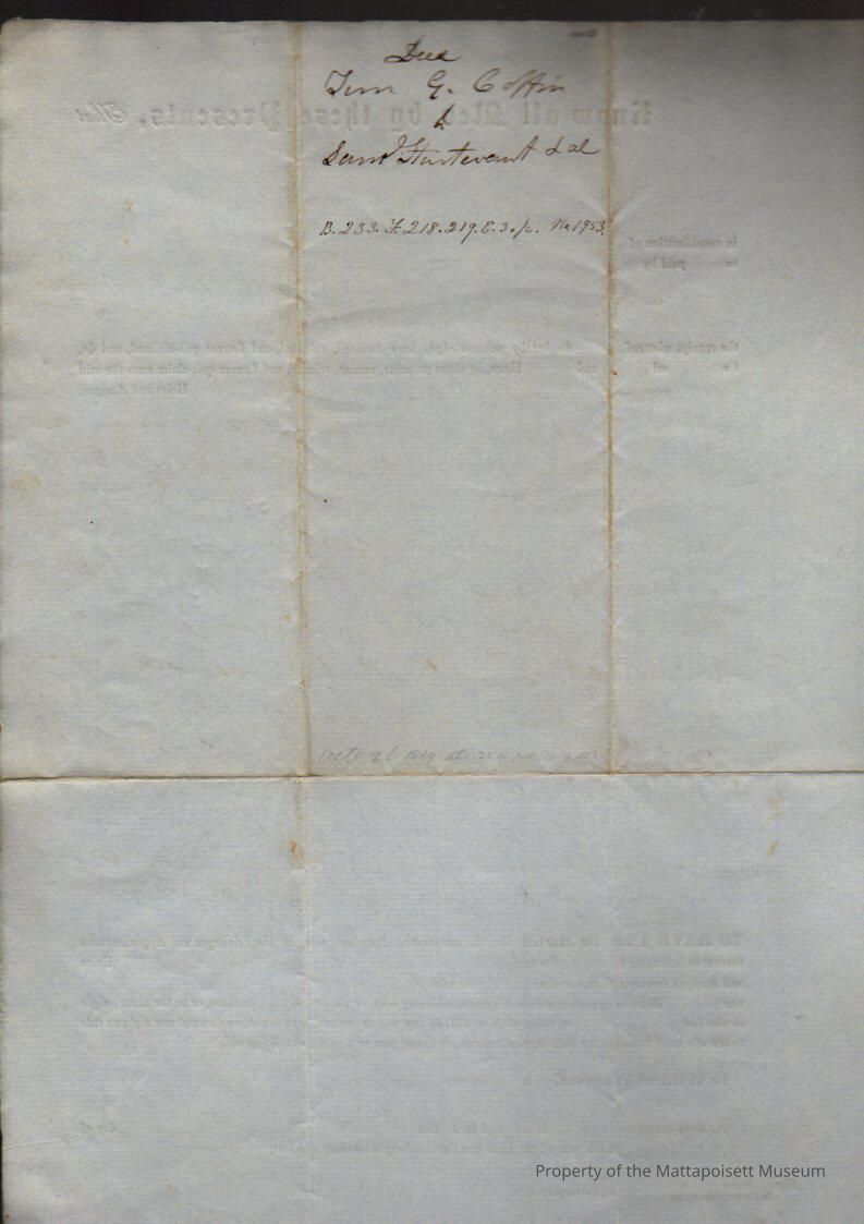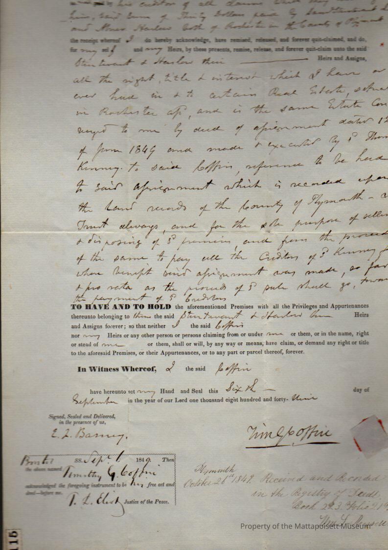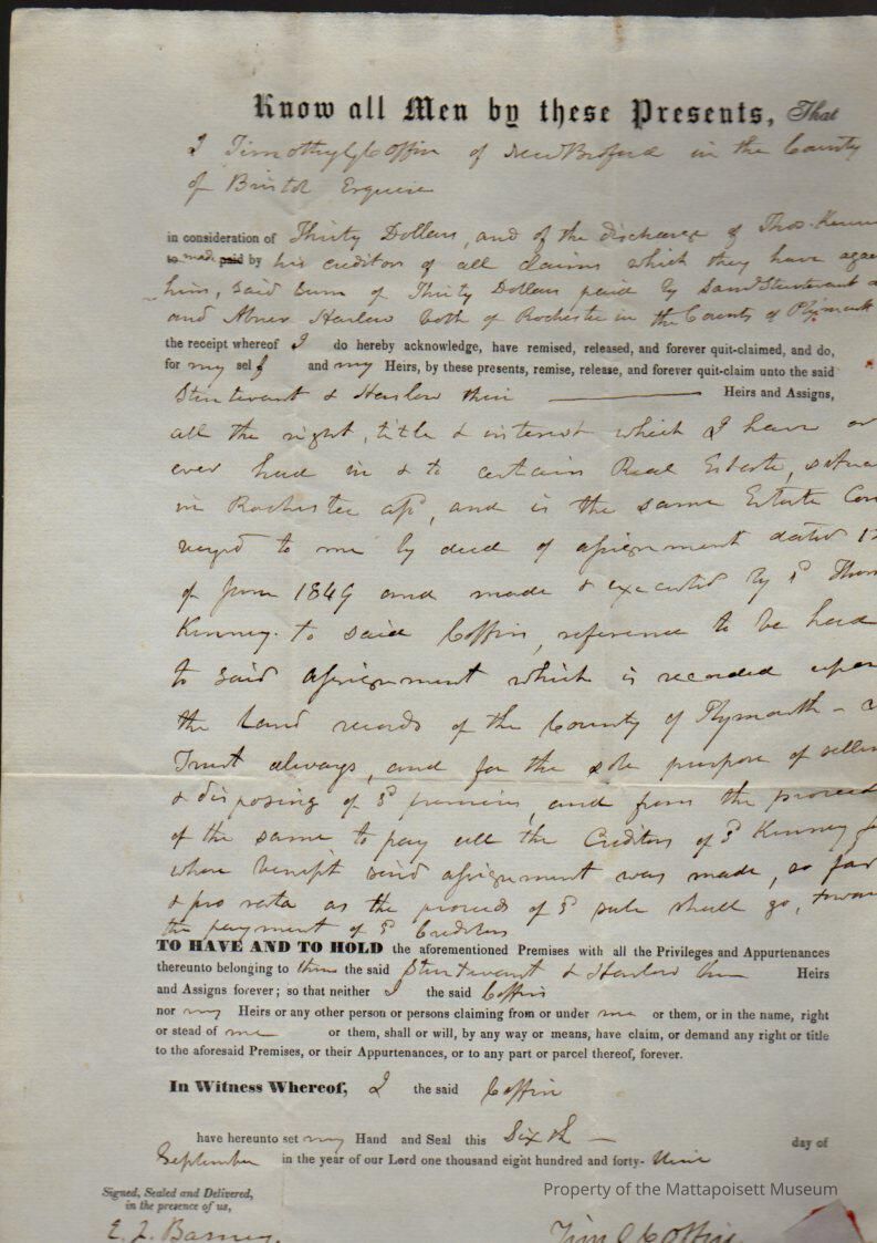 Timothy Coffin of New Bedford to Samuel Sturtevant & Abner Harlow, for $30 and discharge of the Thomas Kinney, paid by his credit, book 223, folio 219.Collection