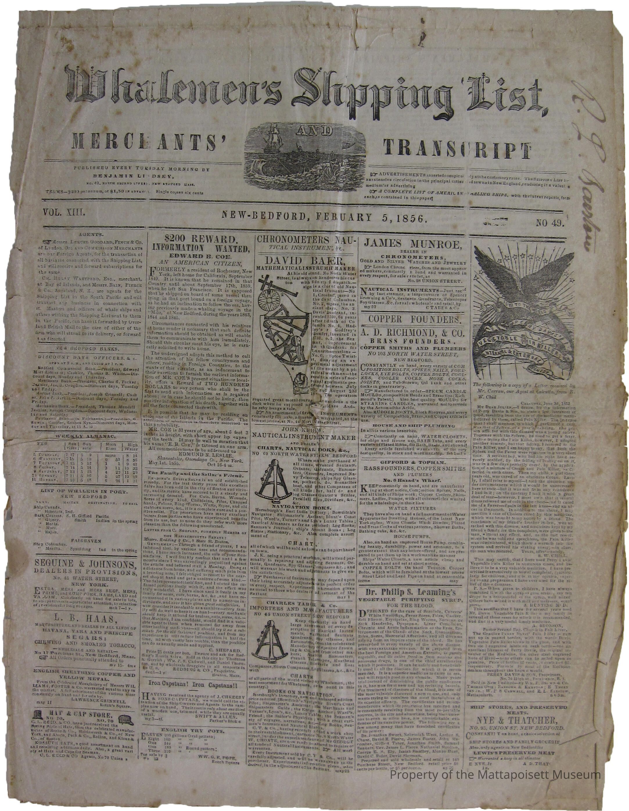 Whalemen’s Shipping List and Merchants’ Transcript. Vol. XIII, No. 49. New Bedford. R. L. Barstow written on side.Acquisition