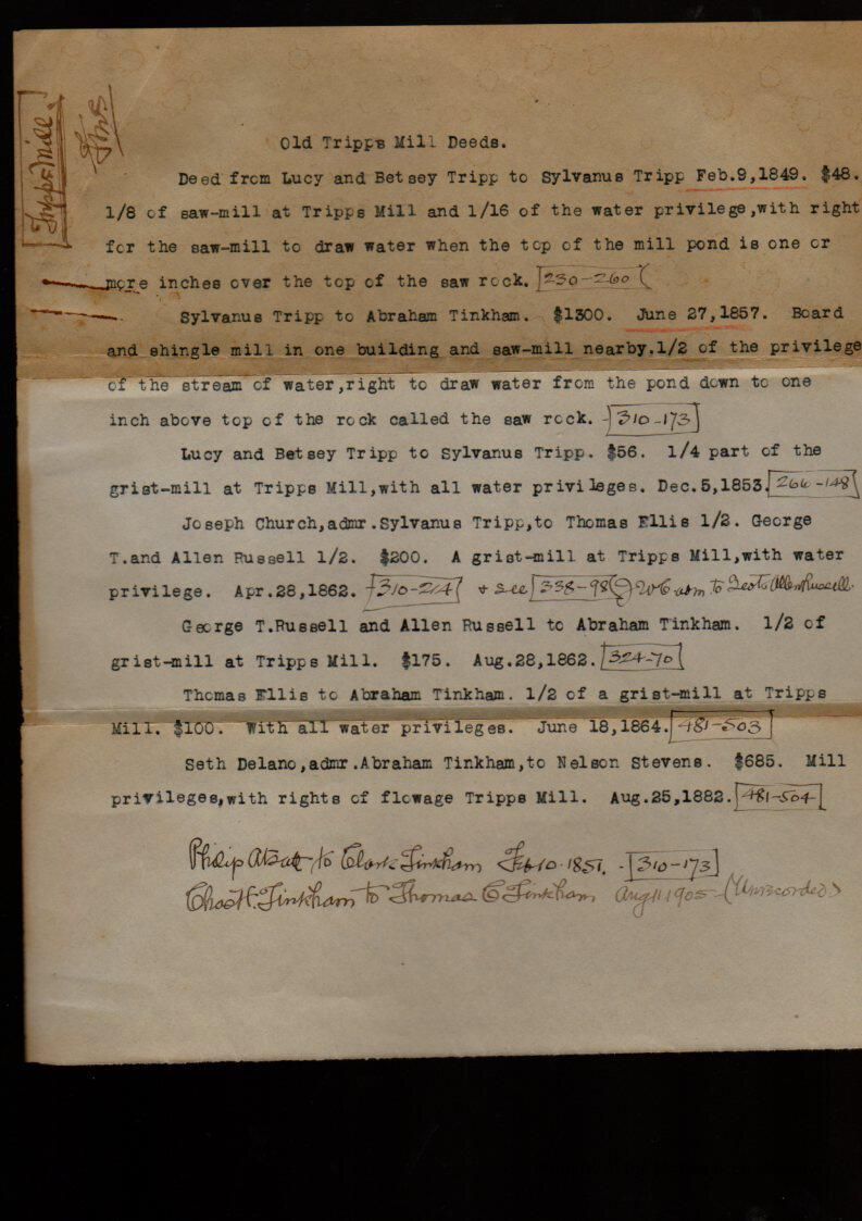 Lucy & Betsy Tripp to Sylvanus Tripp 1/8 of Tripp's Saw Mill and 1/6 water rights for $48. Copy. Also lists subsequent owner of the Tripp Mill.Collection