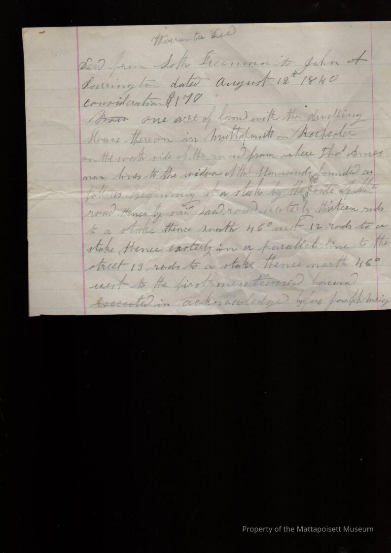 Seth Freeman to John A. Purrington, 1 acre with house for $70. Copy.Collection