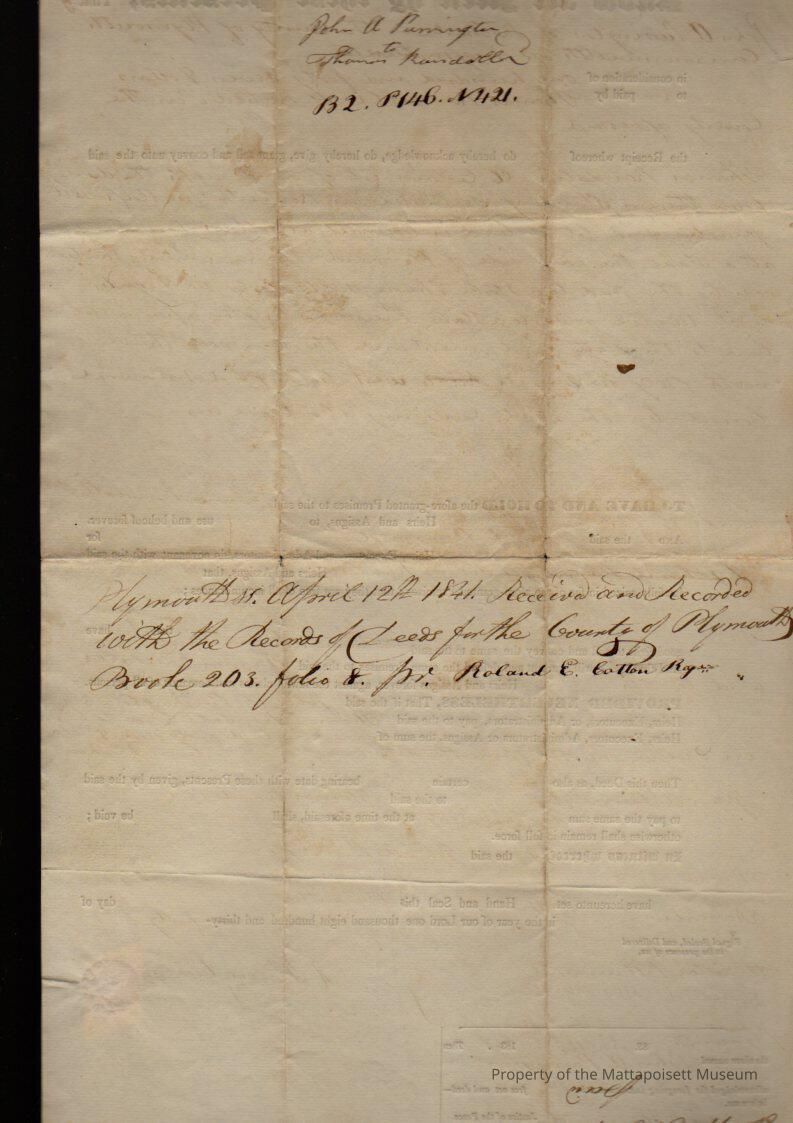 John A. Purrington to Thomas Randall, land and house in Mattapoisett quarter for $147.Collection