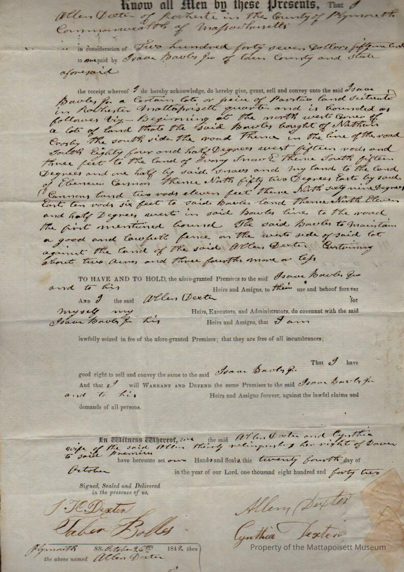 Allen & Cynthia Dexter to Isaac Bowles Jr., pasture in Mattapoisett quarter, 2.5 acres for $247.51.Collection