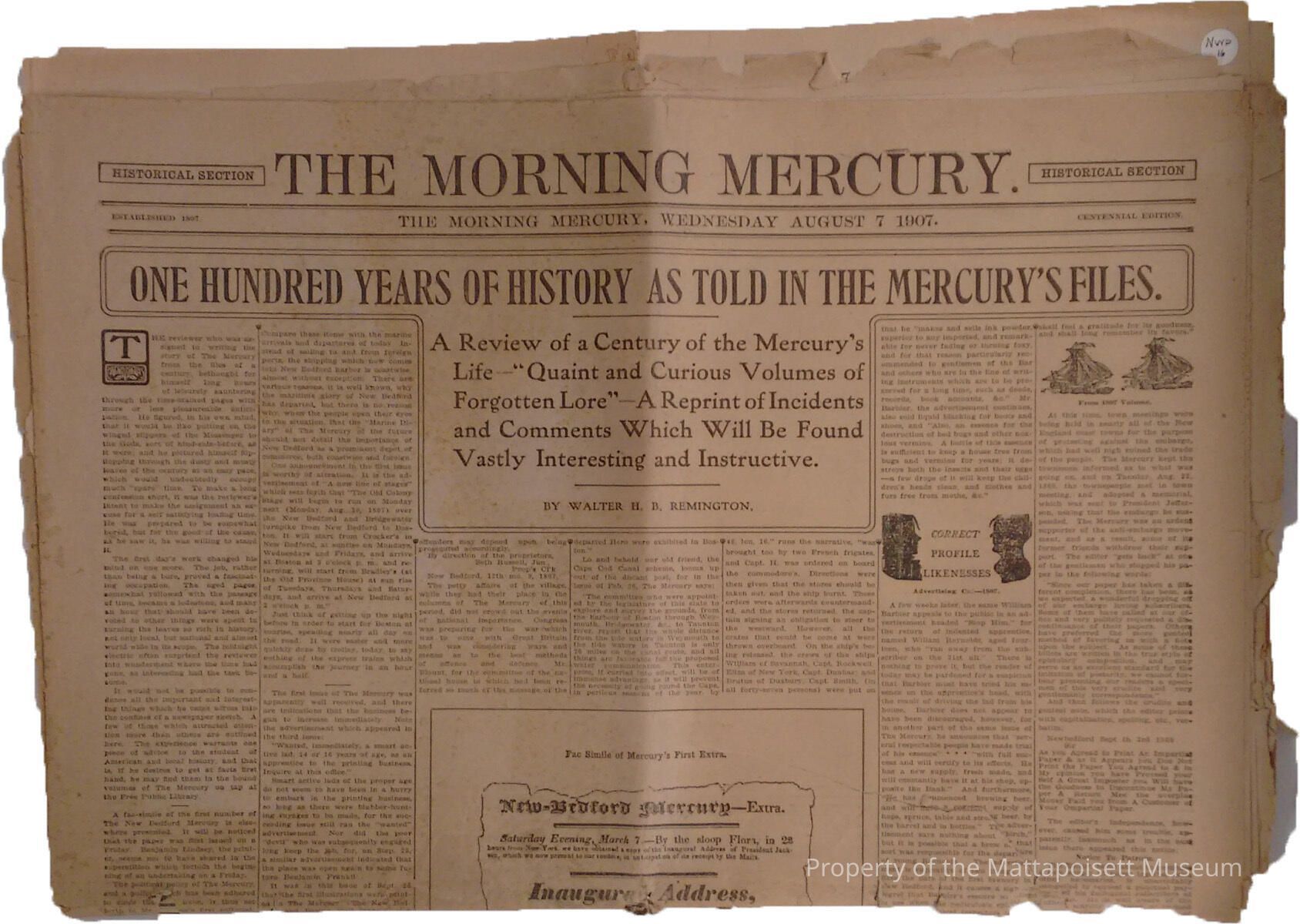 The Morning Mercury. Historical Section, Centennial Edition. New Bedford, Mass, Wednesday, August 7, 1907. Two copies (One from Mendell Collections)Collection