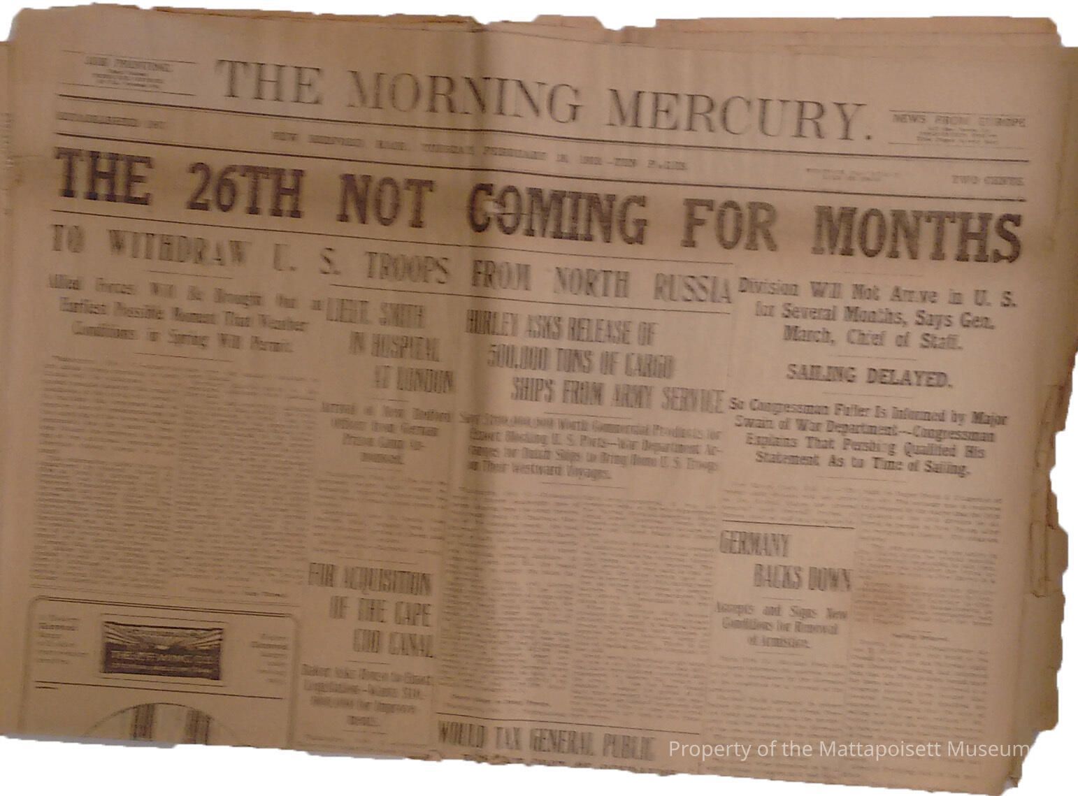 The Morning Mercury. New Bedford, Mass, February 18, 1919. Very brittle.Collection