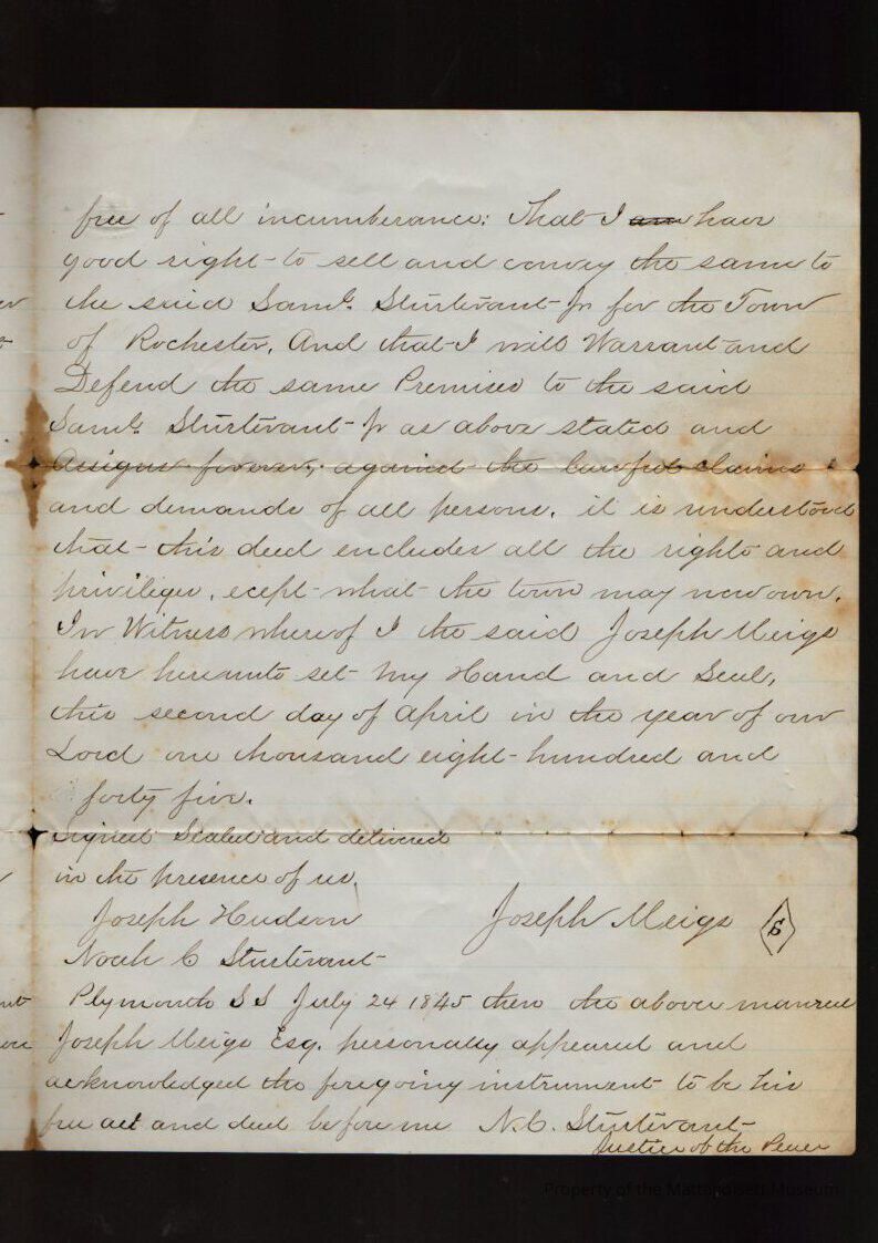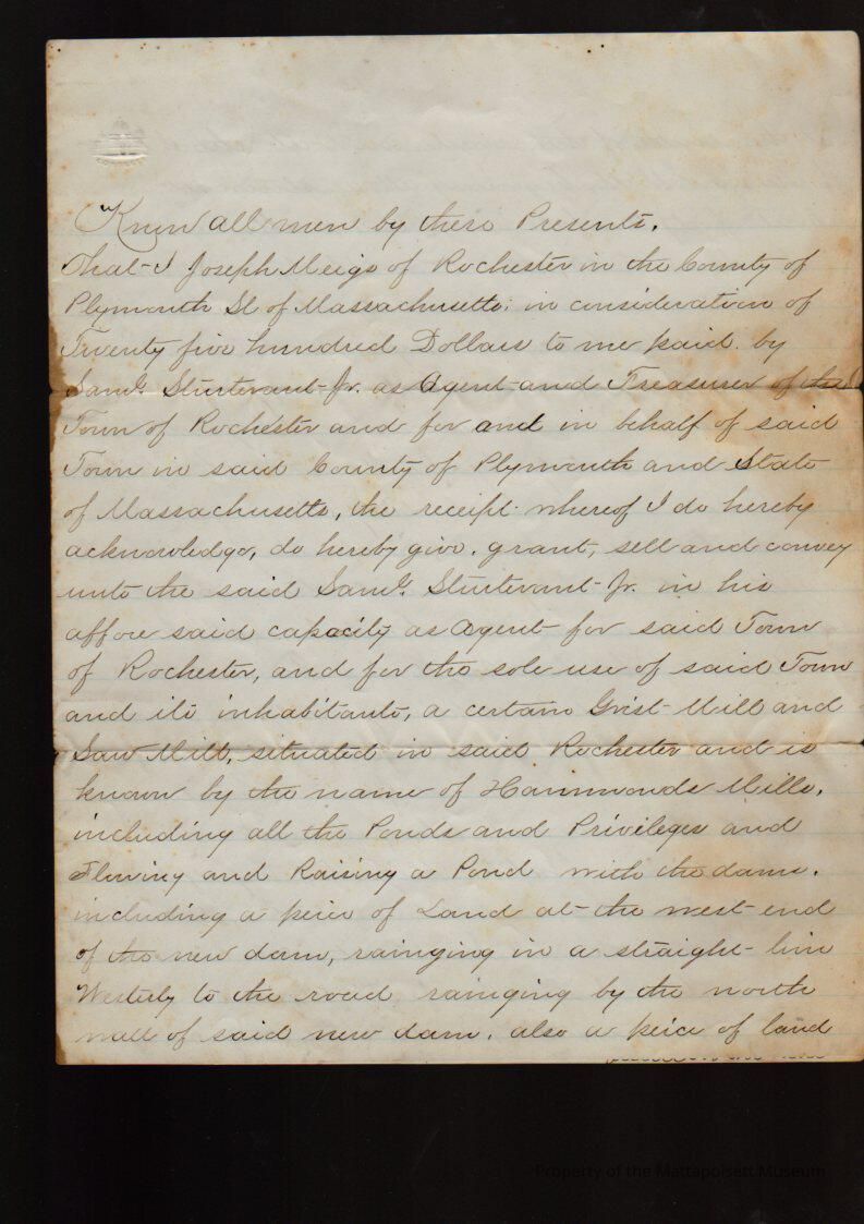 Joseph Meigs to Samuel Sturtevant Jr., agent and treasurer of the Town of Rochester, for said town a grist-mill and saw-mill known by the name of Hammond's Mills, including ponds and privileges for $2,500. Copy.Collection