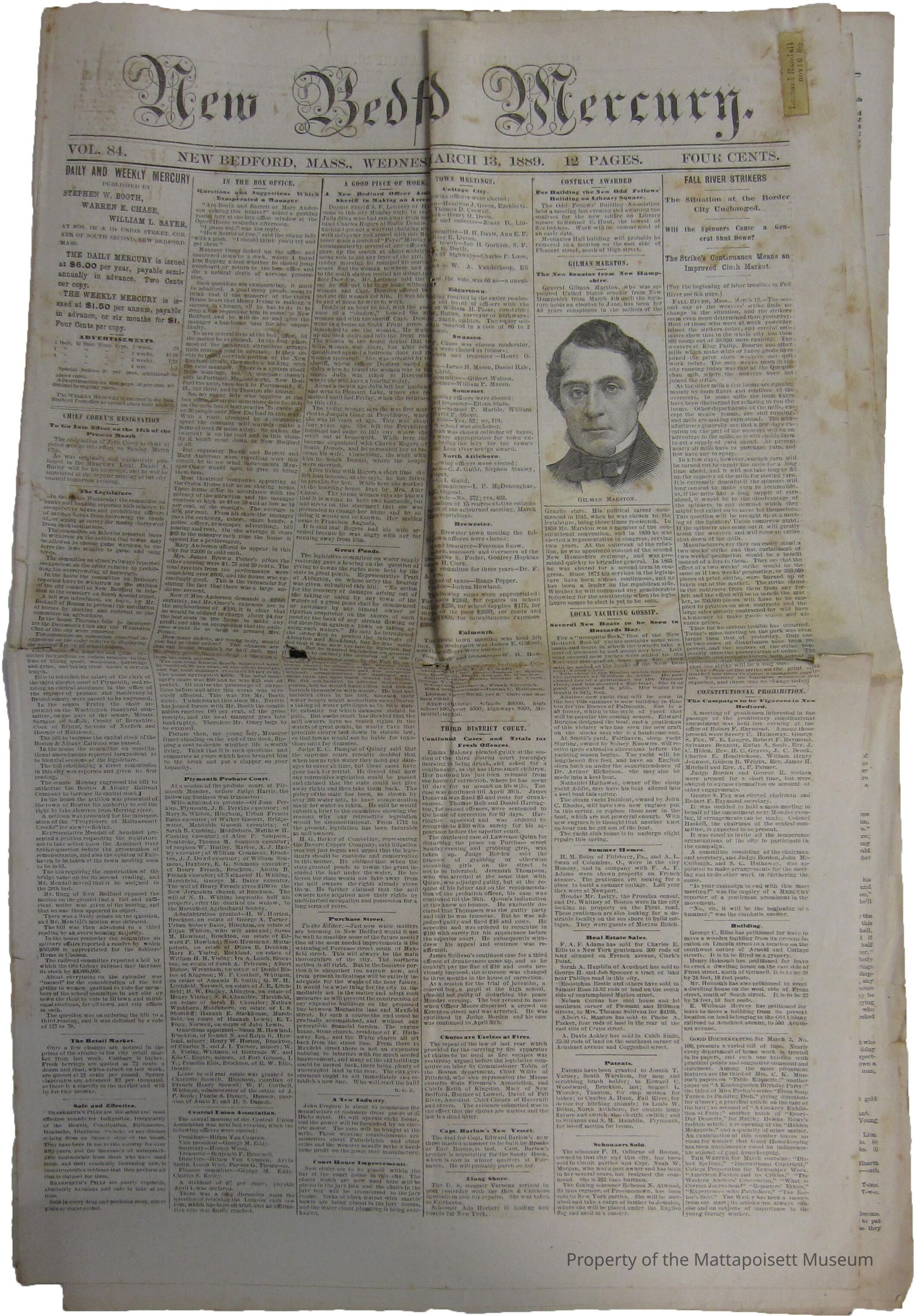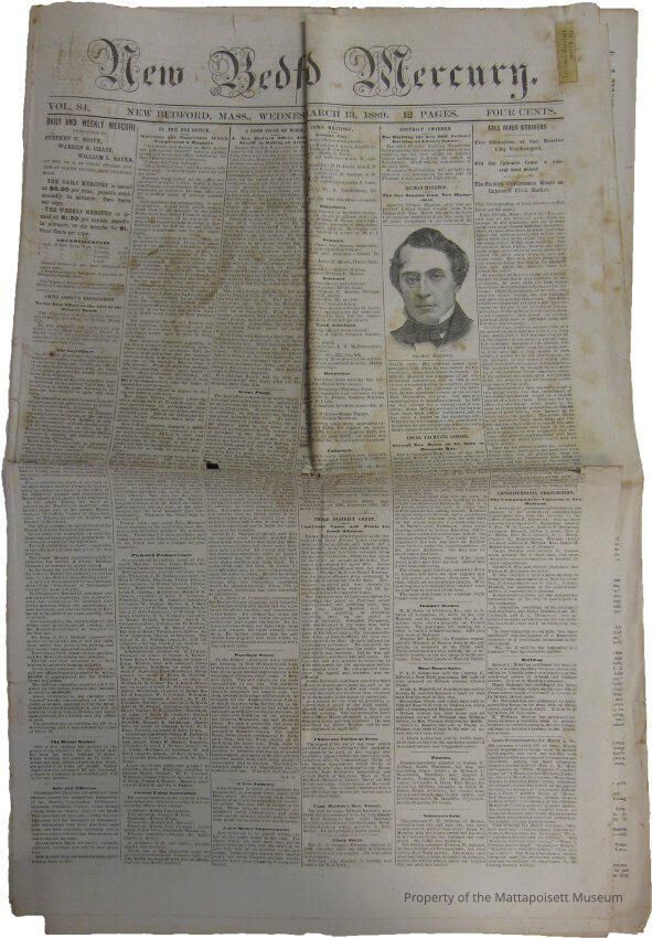 New Bedford Mercury. Vol. 84. Wednesday, March 13, 1889. Has Mattapoisett "gossip" on page 4. Sticker for Leonard Randall.Collection