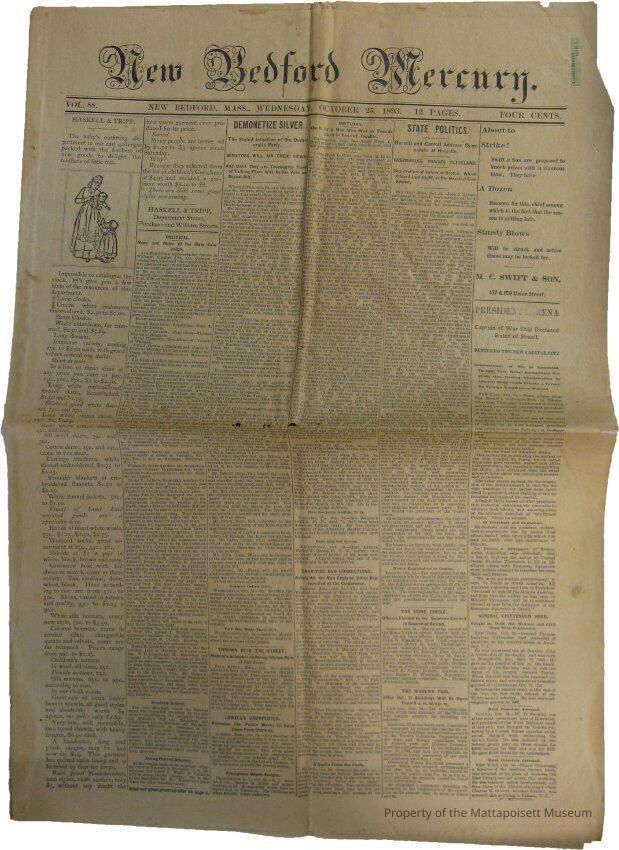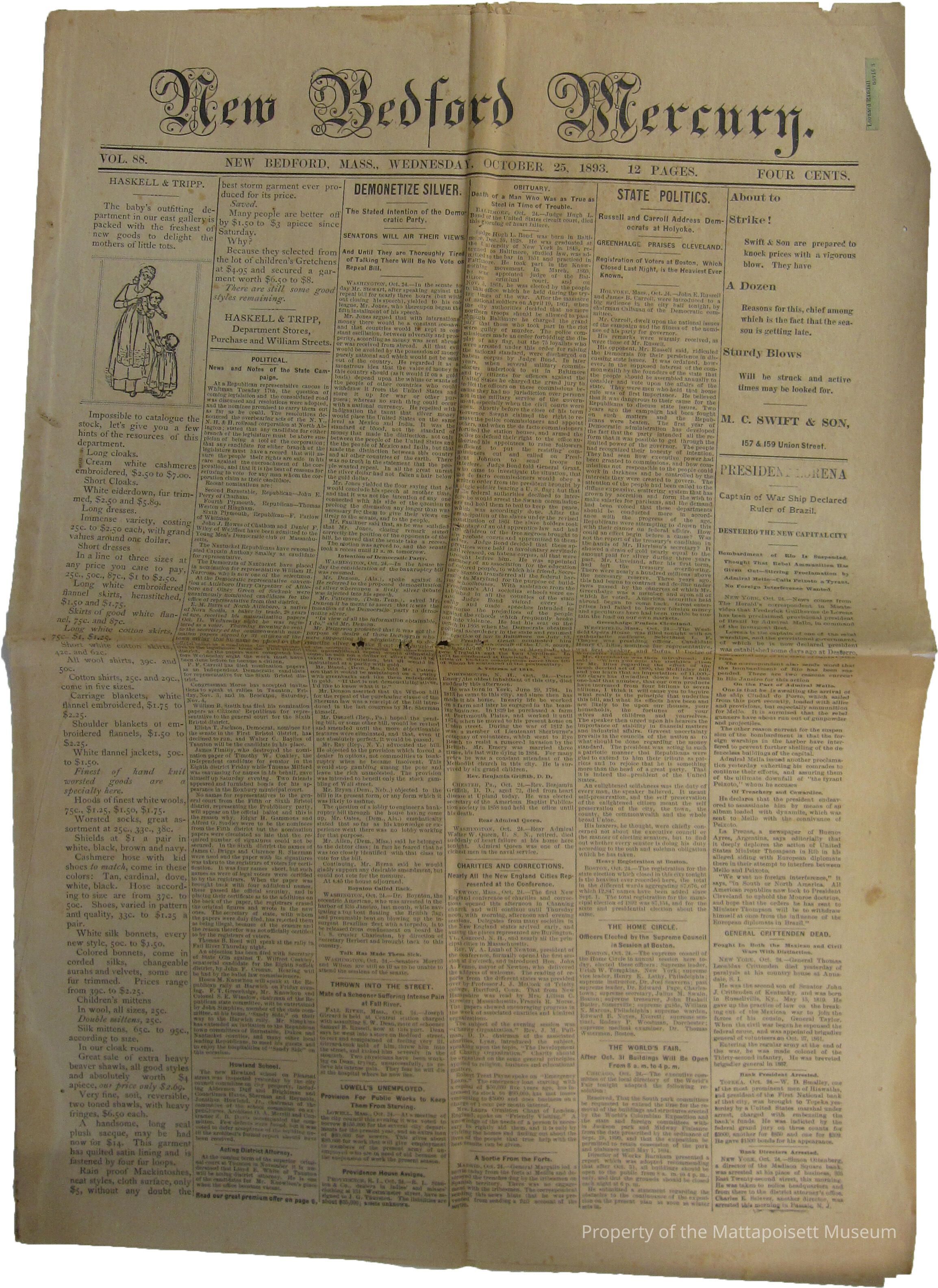 New Bedford Mercury, Vol. 88. Wednesday, October 25, 1893. Mattapoisett "gossip" on page 5. Deaths October 21, M. C. Nye died suddenly at age 51 years, 9 months; October 15th, Henry Mosher, 75.Acquisition