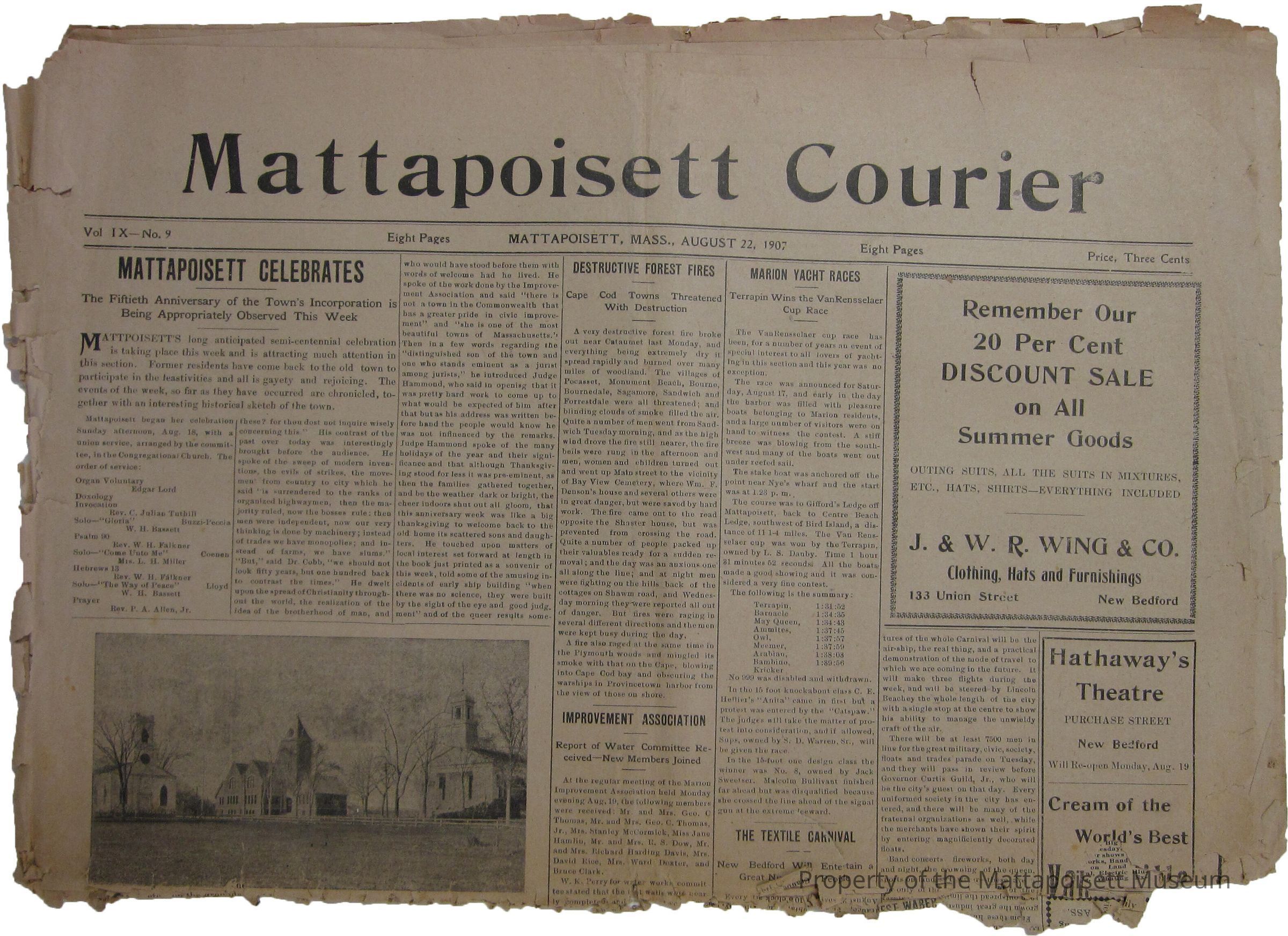 Mattapoisett Courier. Vol. IX, No. 9. Mattapoisett, Mass. August 22, 1907. Eight pages.Acquisition