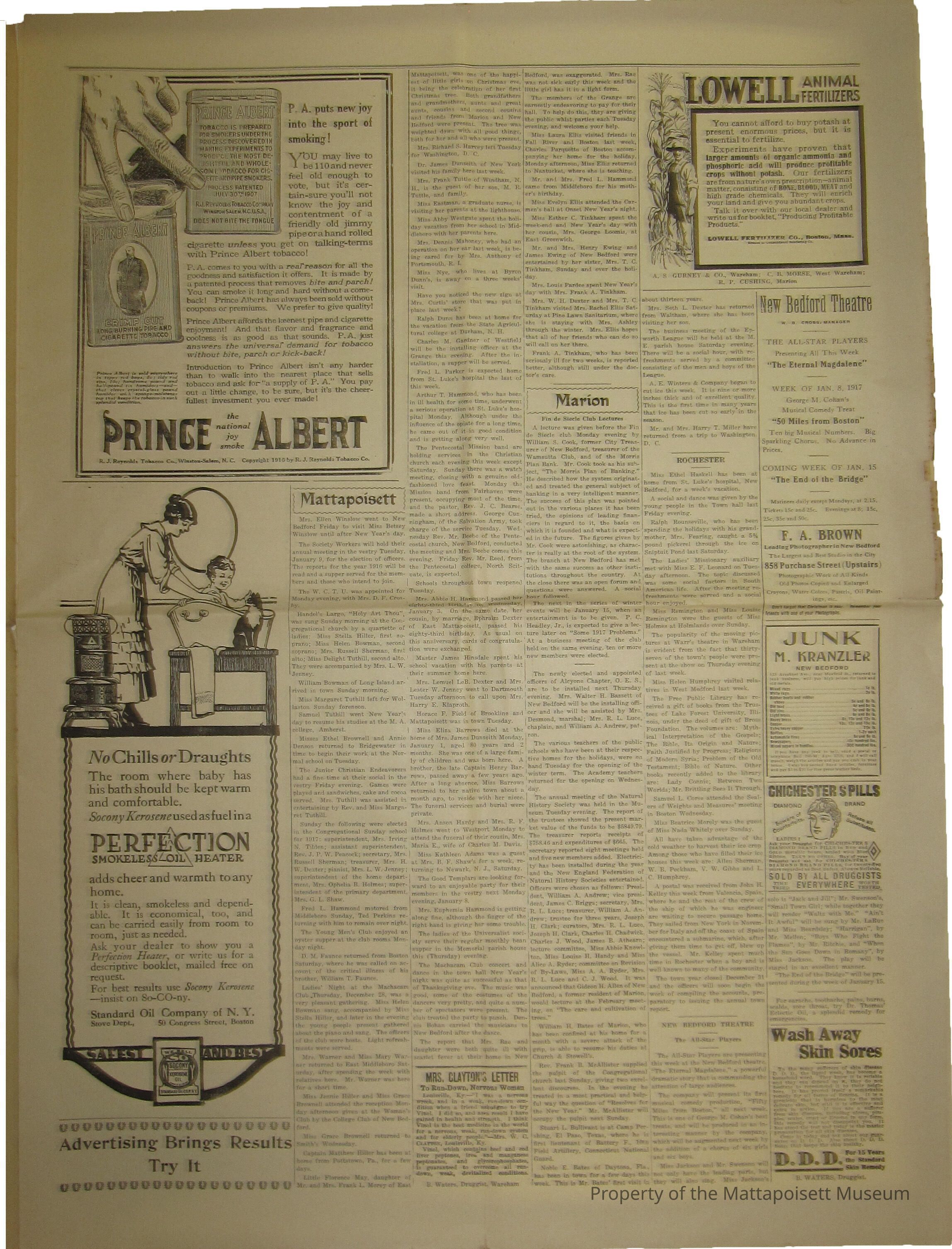Mattapoisett Courier. Vol. XVIII, No. 29. Mattapoisett, Mass. January 4, 1917. Paper shortage.Acquisition