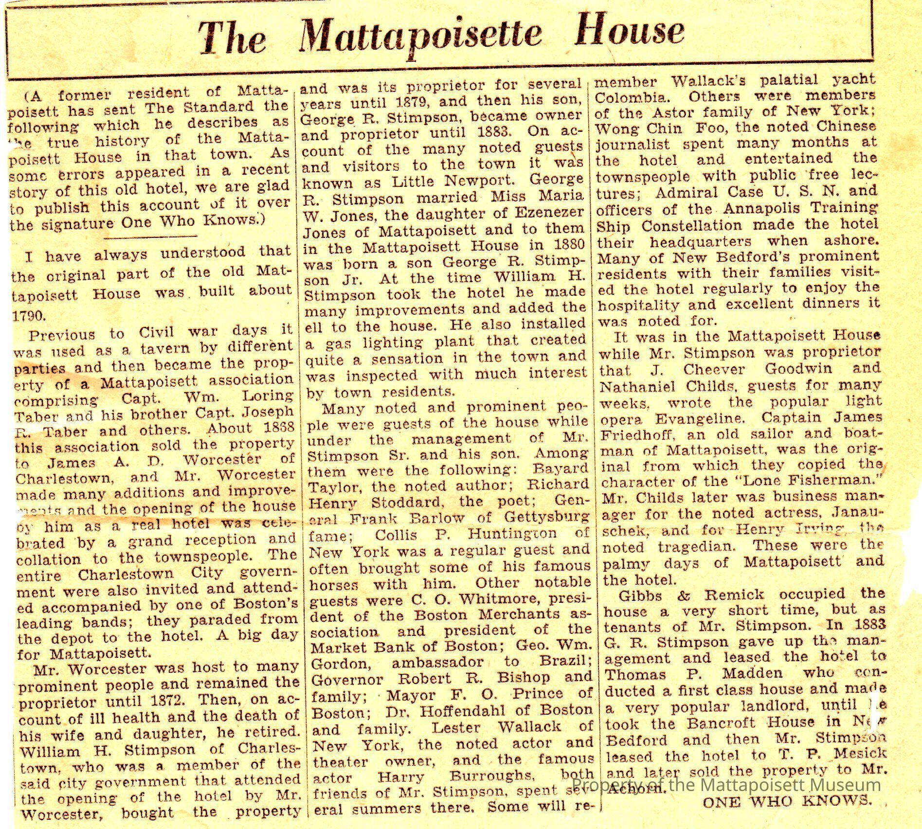 Newspaper clipping from New Bedford Evening Standard. December 26, 1931. The Mattapoisette House. A former resident of Mattapoisett has sent The Standard the following which he descripbes as the true history of the Matatpoisett House in that town. As some errors appeared in a recent history of this old hotel, we are glad to publish this account of it over the signature One Who Knows. This hotel, NOT to be confused with Bayview Hotel also later owned by Maddens above, Bayview was the name of the now "Matt. Inn" when the Madden's owned it. Old postcards show it as a Greek Revival facade.Collection