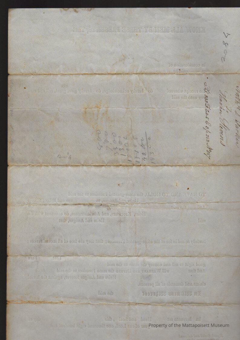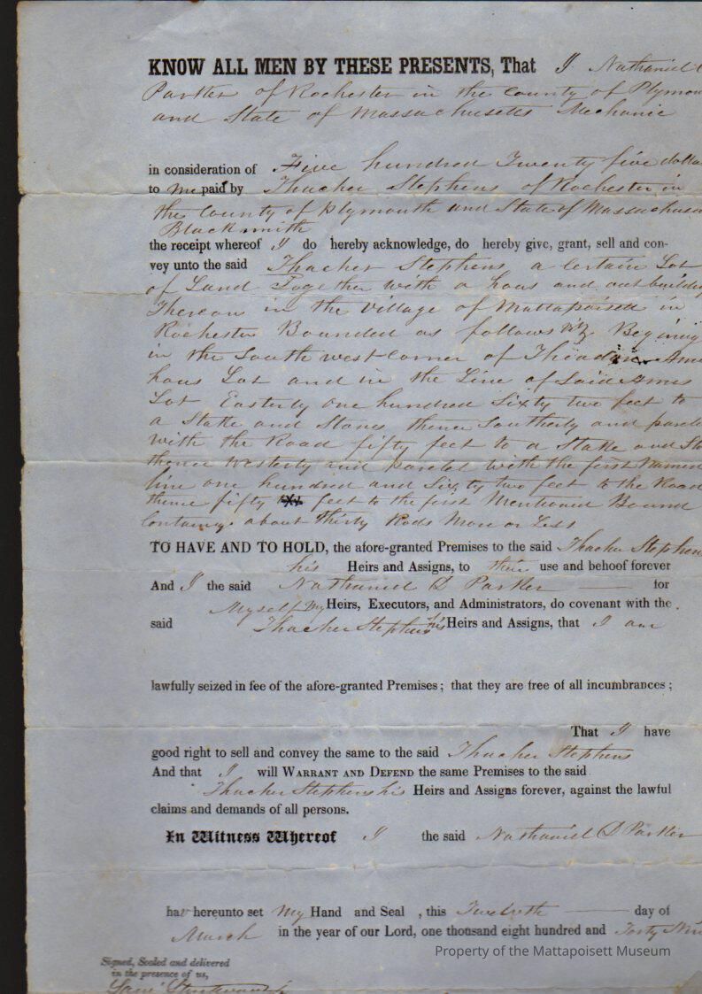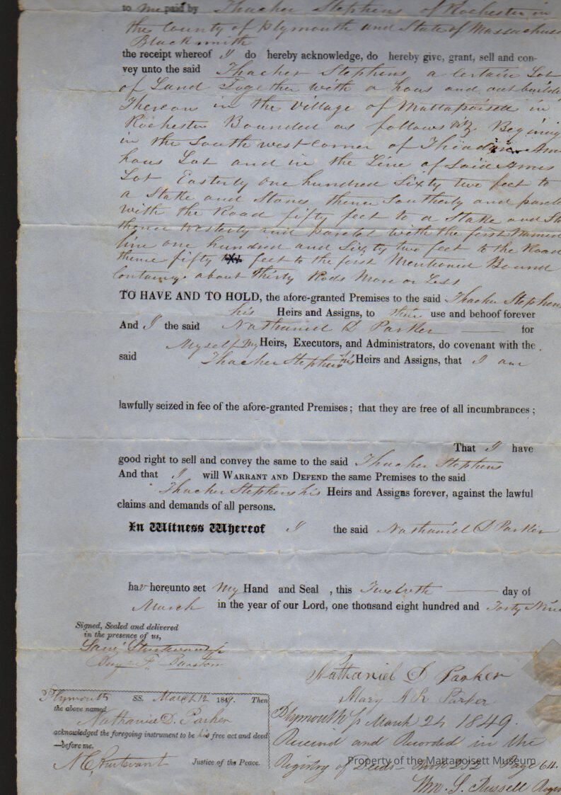 Nathaniel O. & Mary A. R. Parker to Thacher Stevens, 30 rods in Mattapoisett Village for $525.Collection