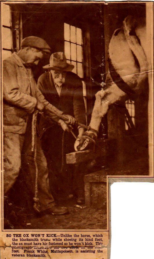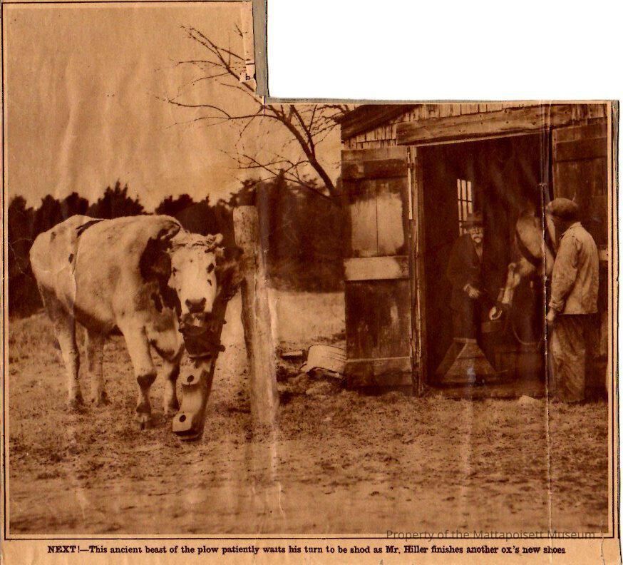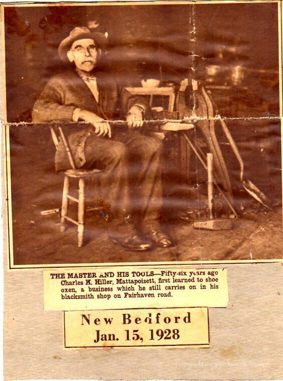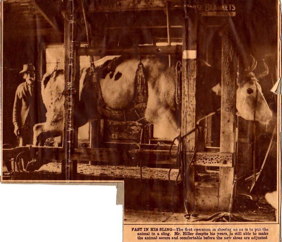 Series of photographs of Charles H. Hiller and his oxen from newspaper or magazine. Charles Hiller, blacksmith. His shop is now William Johnson's cabinet shop. The master and his tools - fifty-six years ago Charles H. Hiller, Mattapoisett, first learned to shoe oxen, a business which he still carries on in his blacksmith shop on Fairhaven Road. New Bedford, January 15, 1928. So the ox won't kick - unlike the horse, which the blackmith trusts while shoeing its hind foot, the ox must have his fastened so he won't kick. This photograph iluustrates the two shoes on the hind foot. Frank White, Mattapoisett, is assisting the veteran blacksmith. Next! - This ancient beast of the plow patiently waits his turn to be shod as Mr. Hiller finishes another ox's new shoes. Fast in his sling - The first operation in shoeing an ox is to put the animal in a sling. Mr. Hiller despite his years, is still able to make the animal secure and confortable before the new shoes are adjusted.Acquisition
