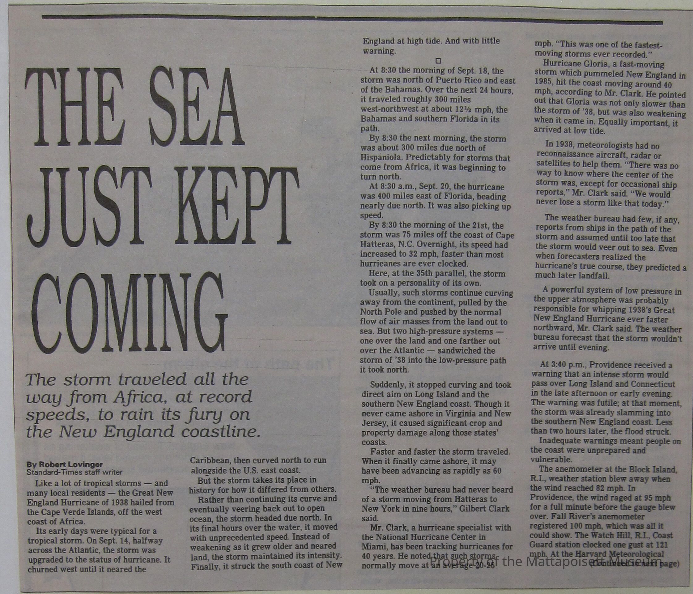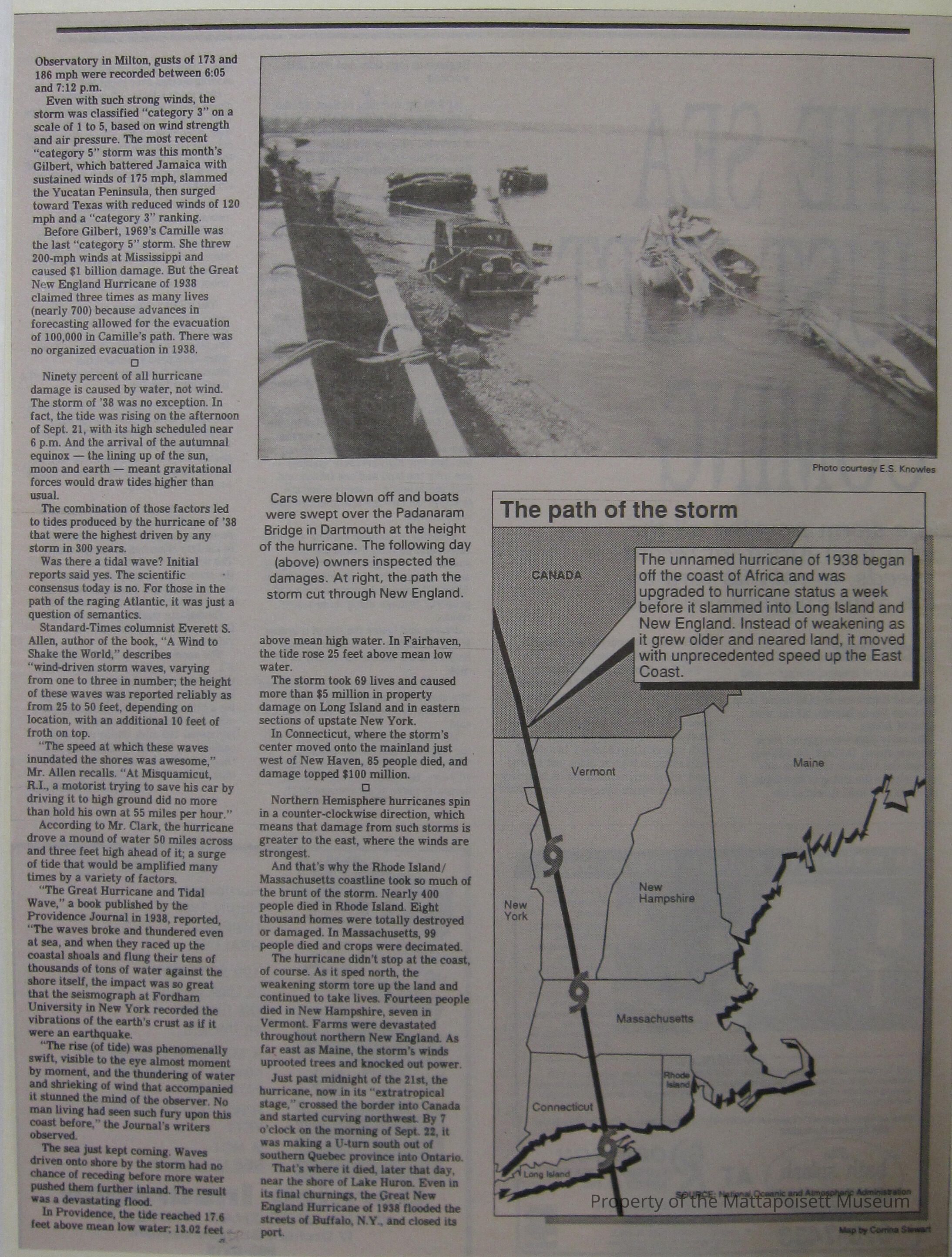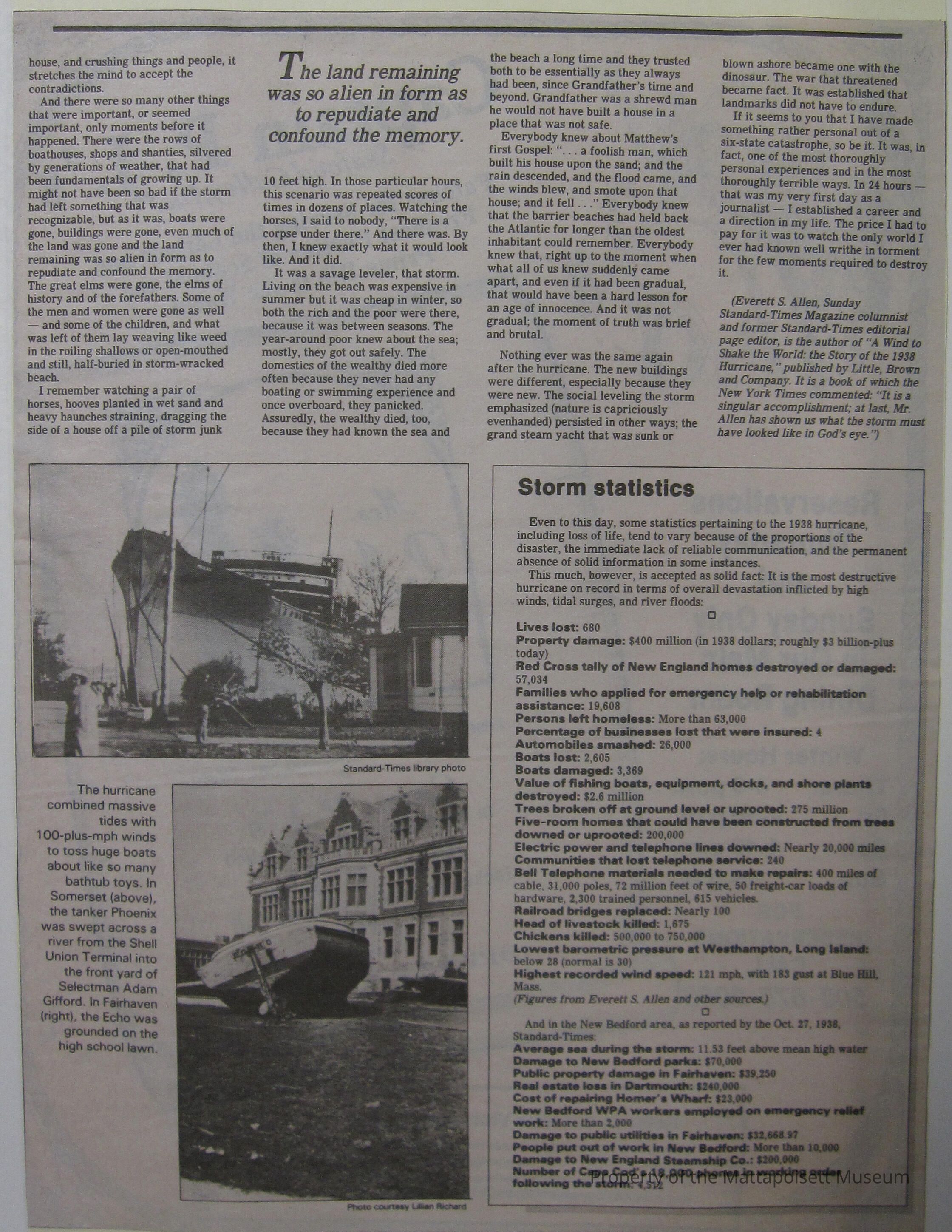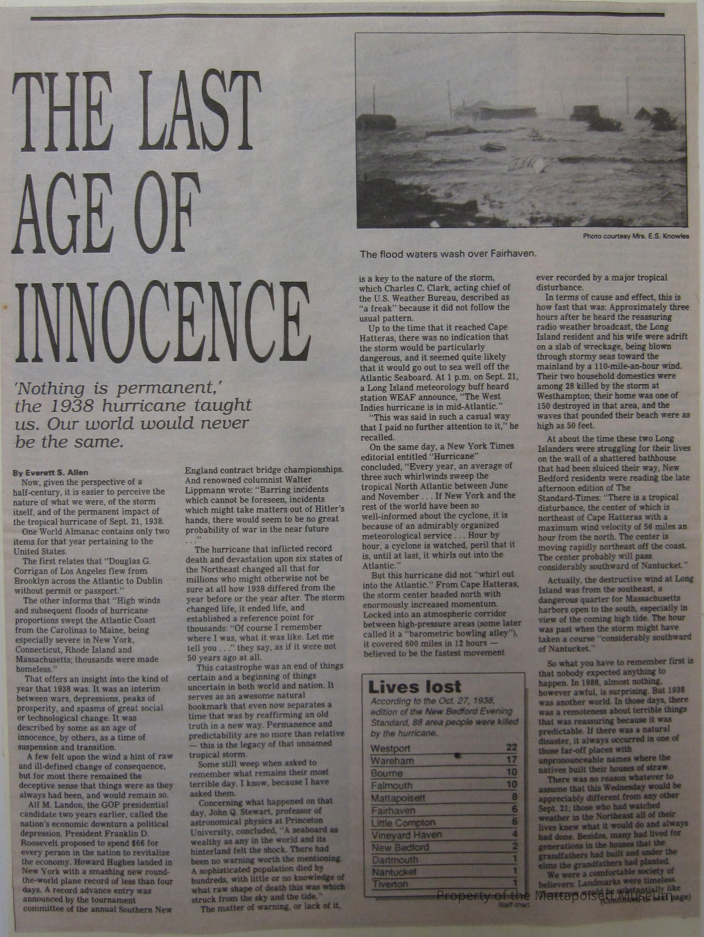 50th Anniversary of the 1938 Hurricane. Wednesday, September 21, 1988. Newspaper clippings, no publication (possibly New Bedford Standard Times) or edition information, and photographs of the 1938 hurricane. Everett S. Allen, writing The Last Age of Innocence, and Robert Lovering The Sea Just Kept Coming.Acquisition
