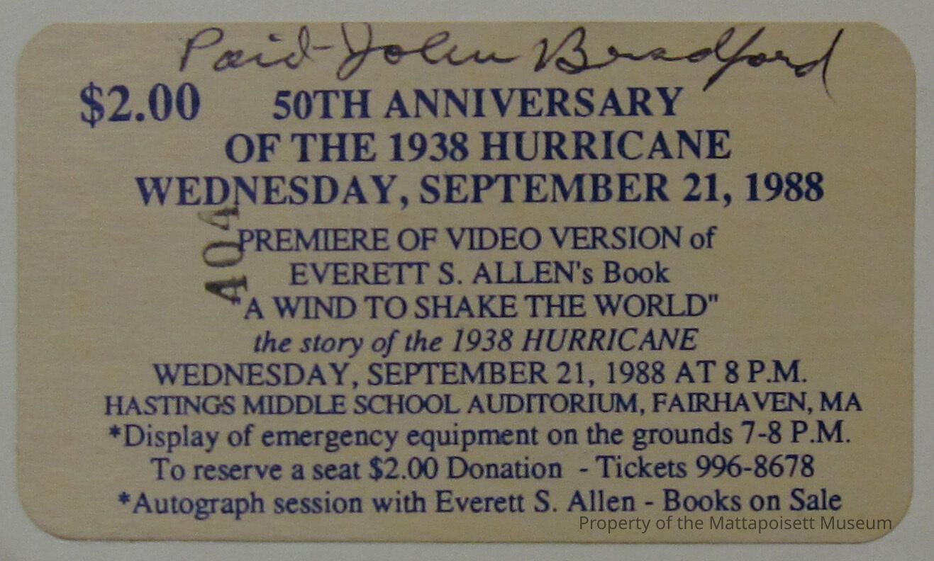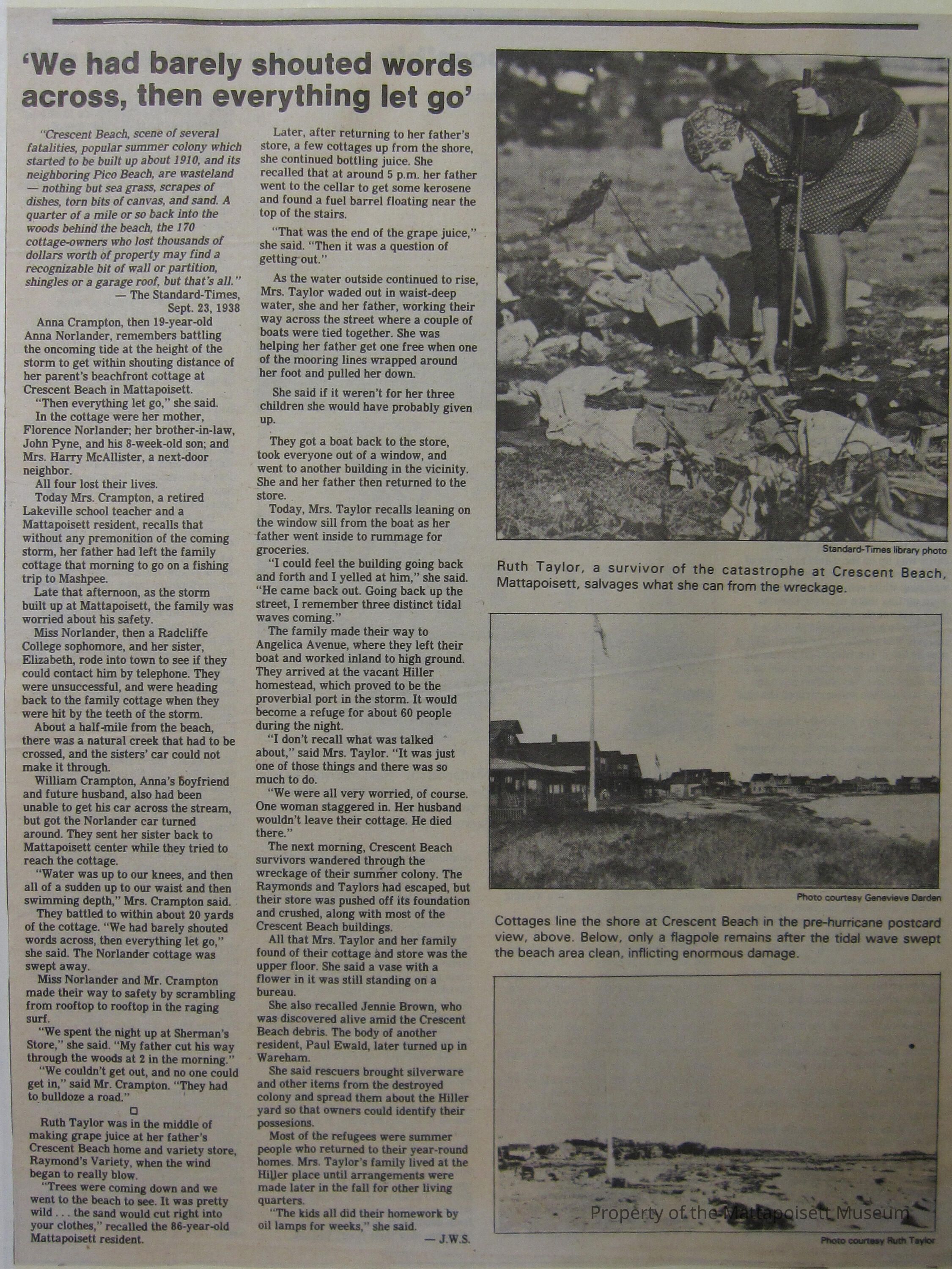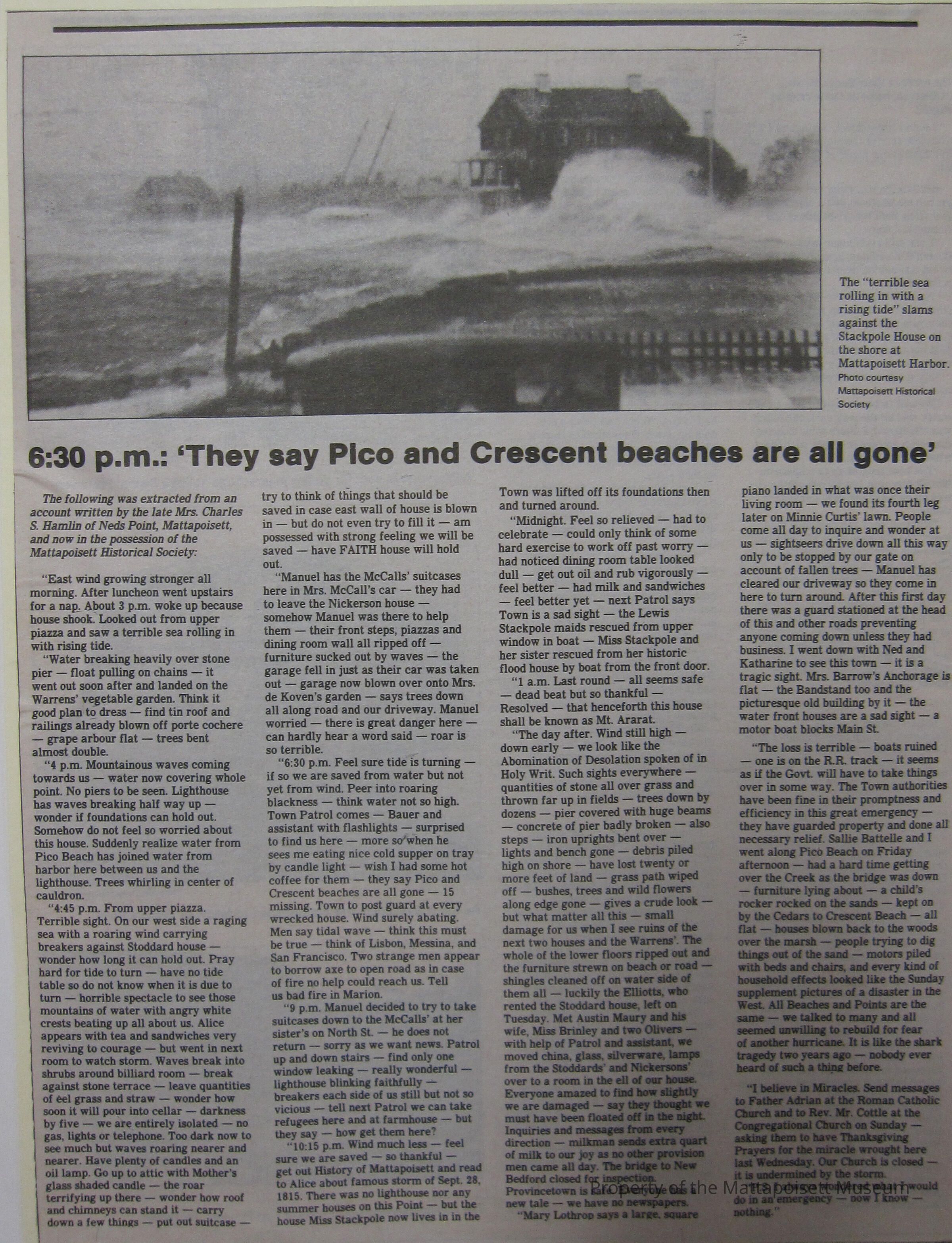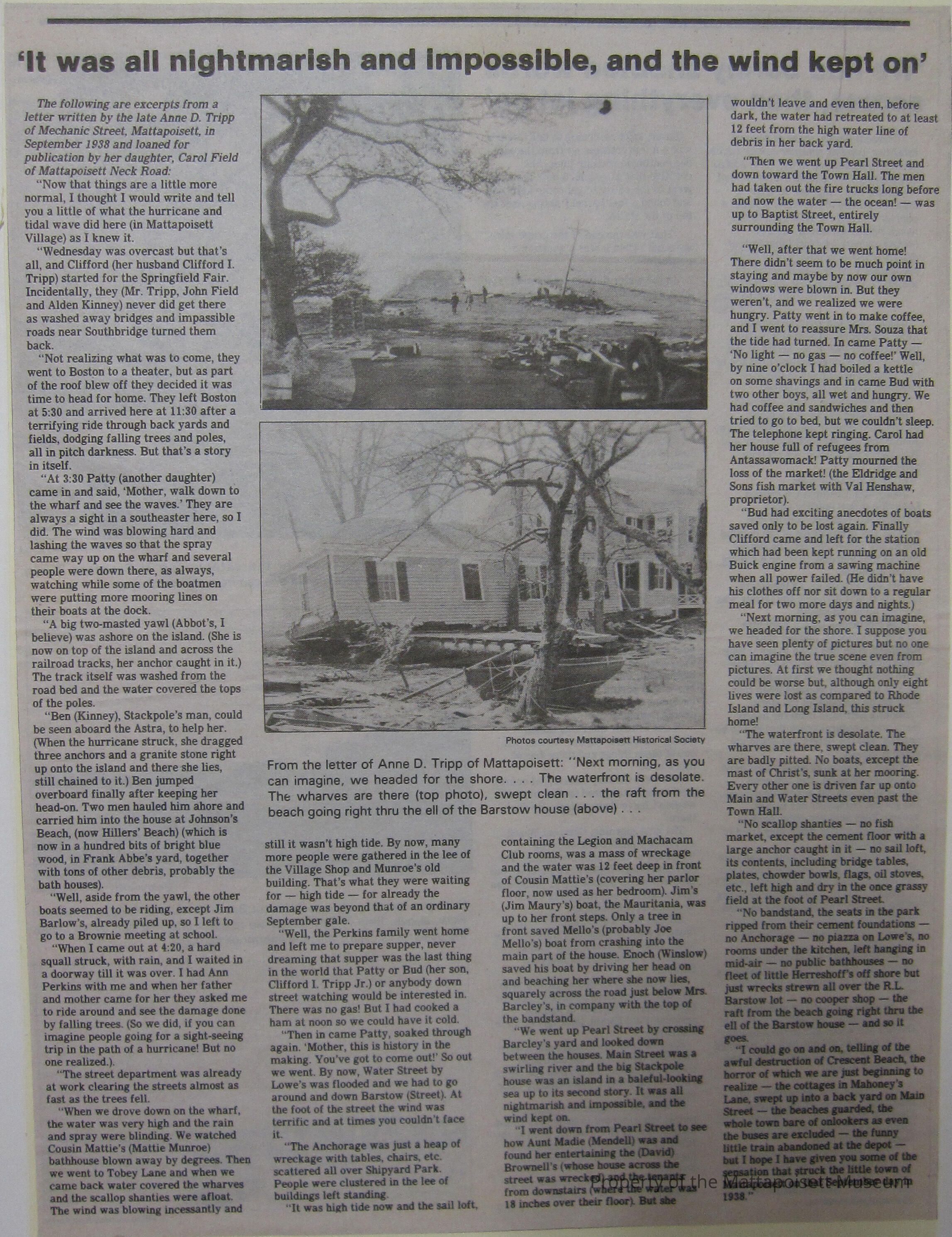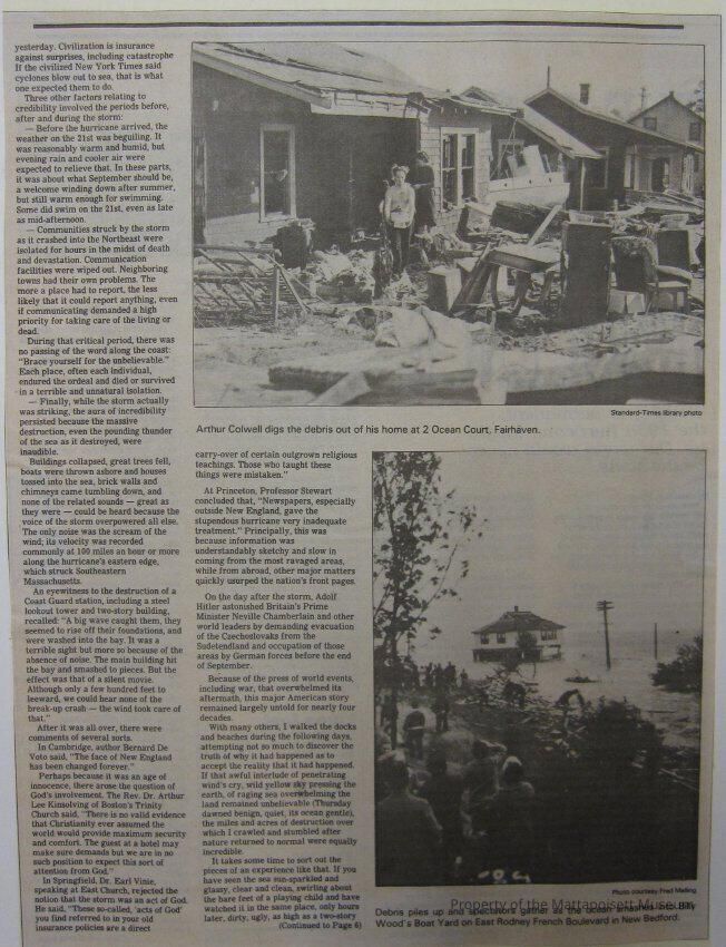 50th Anniversary of the 1938 Hurricane. Wednesday, September 21, 1988. Newspaper clippings, no publication (possibly New Bedford Standard Times) or edition information, and photographs of the 1938 hurricane. Everett S. Allen, writing The Last Age of Innocence, and Robert Lovering The Sea Just Kept Coming.Acquisition