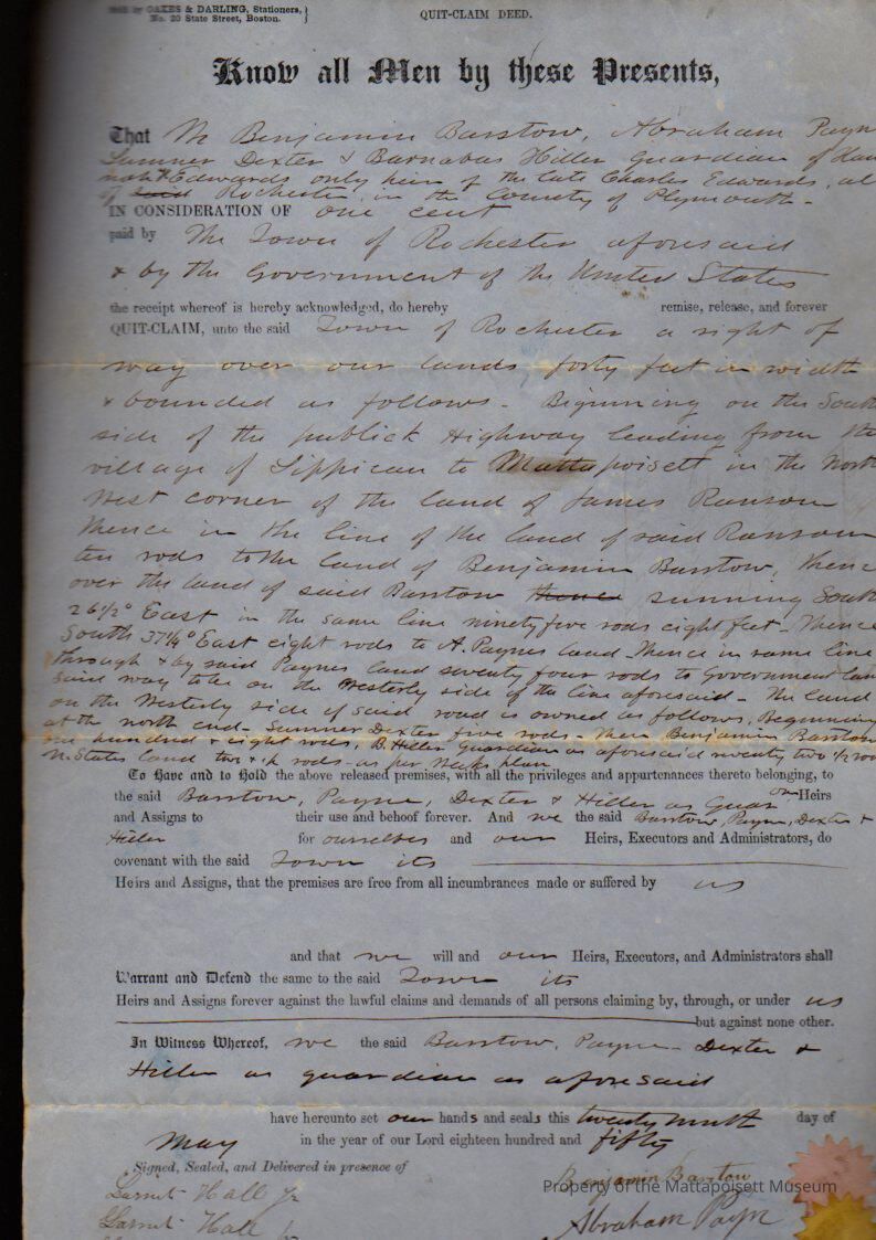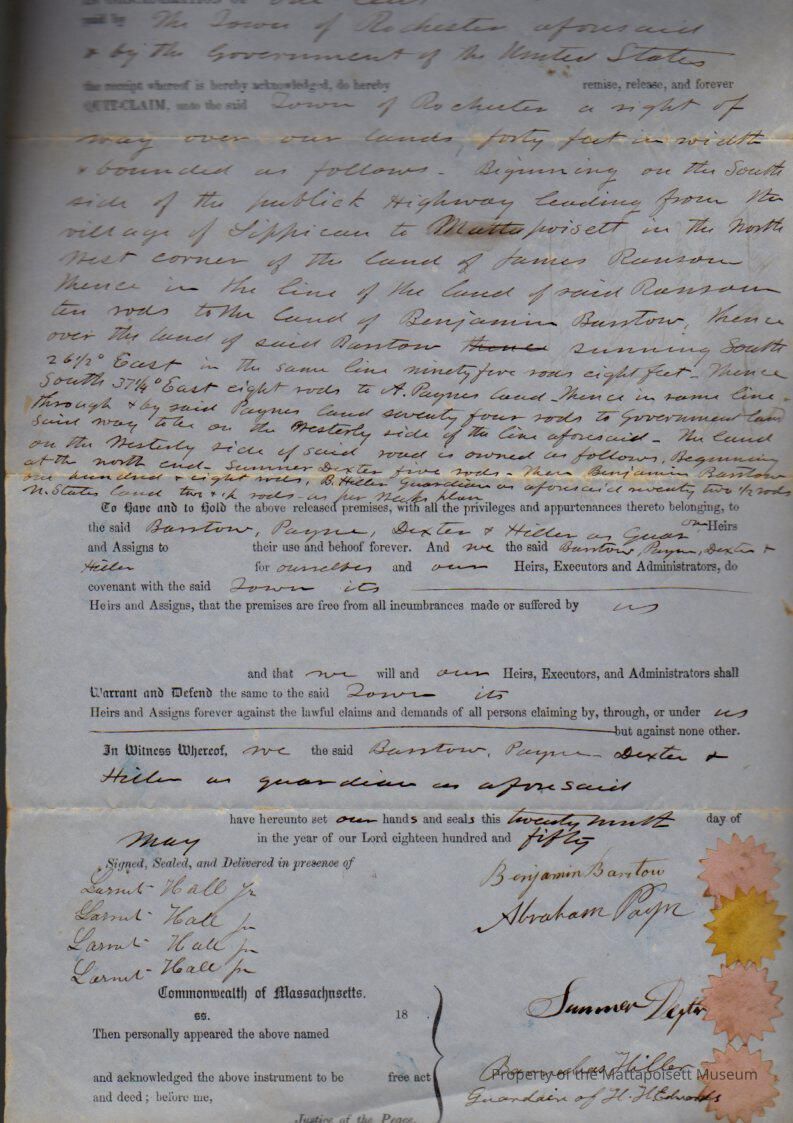 Benjamin Barstow, Abraham Payne, Sumner Dexter & Barnabas Hill, guardians of Hannah K. Edwards of late Charles Edwards to Town of Mattapoisett, 40 feet right of way for $.01.Collection