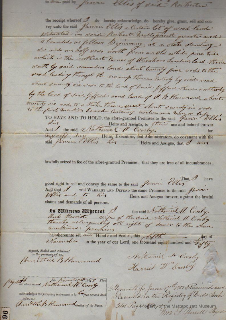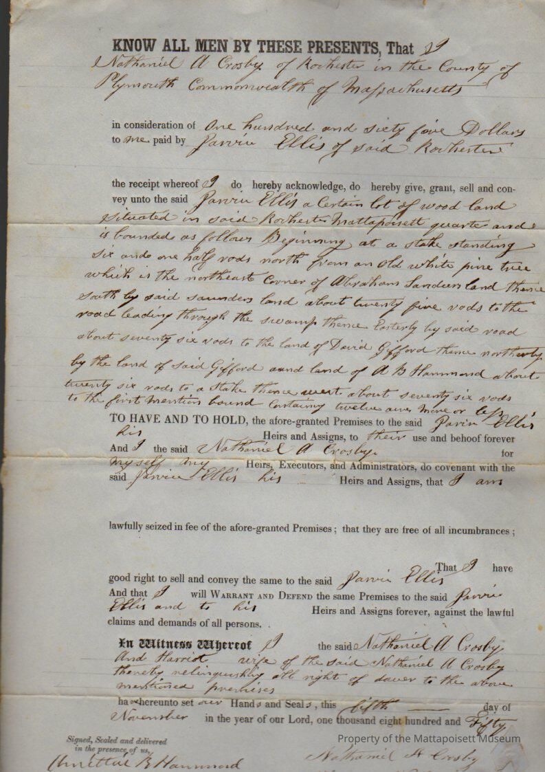 Nathaniel A.& Harriet W. Crosby to Jarvis Ellis, 12 acres woodland in Mattapoisett quarter for $165.Collection