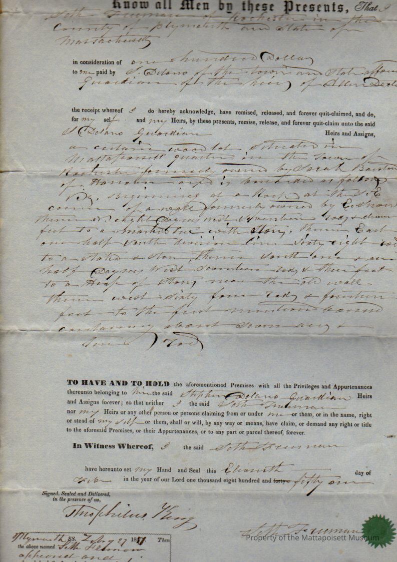 Seth Freeman to S. Delano, guardian of Allen Dexter, 7 acres, 10 rods of woodlot in Mattapoisett quarter for $100.Collection