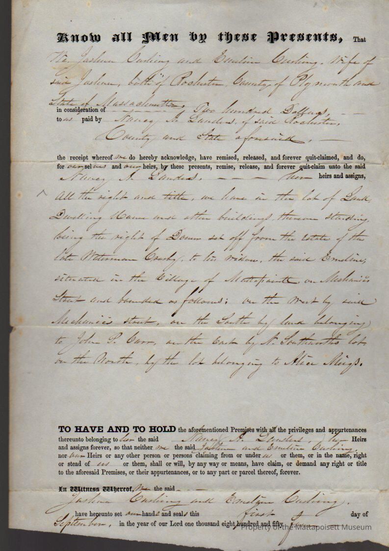 Joshua & Emeline Cushing to Nancy A. Sanders, land and dwelling house on Mechanic Street in Mattapoisett Village for $200.Collection