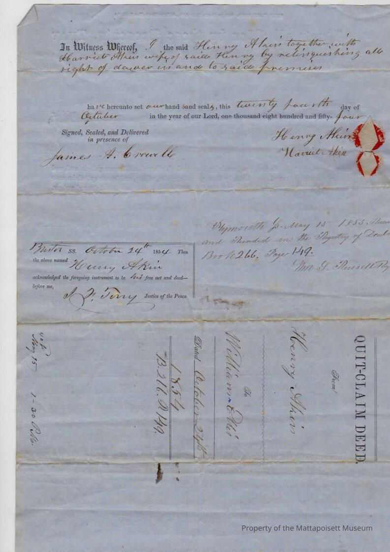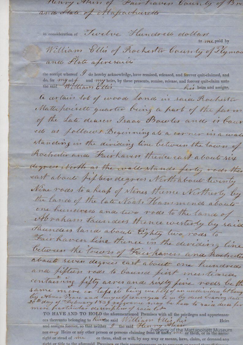 Henry & Harriet Akin of Fairhaven to William Ellis, 50 acres, 65 rods of woodland in Mattapoisett quarter for $1,200.Collection