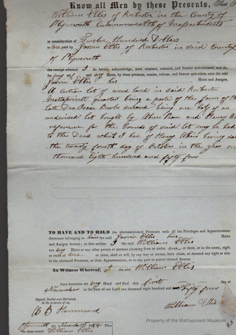 William Ellis to Jarvis Ellis, woodland in Mattapoisett quarter for $1,200.Collection