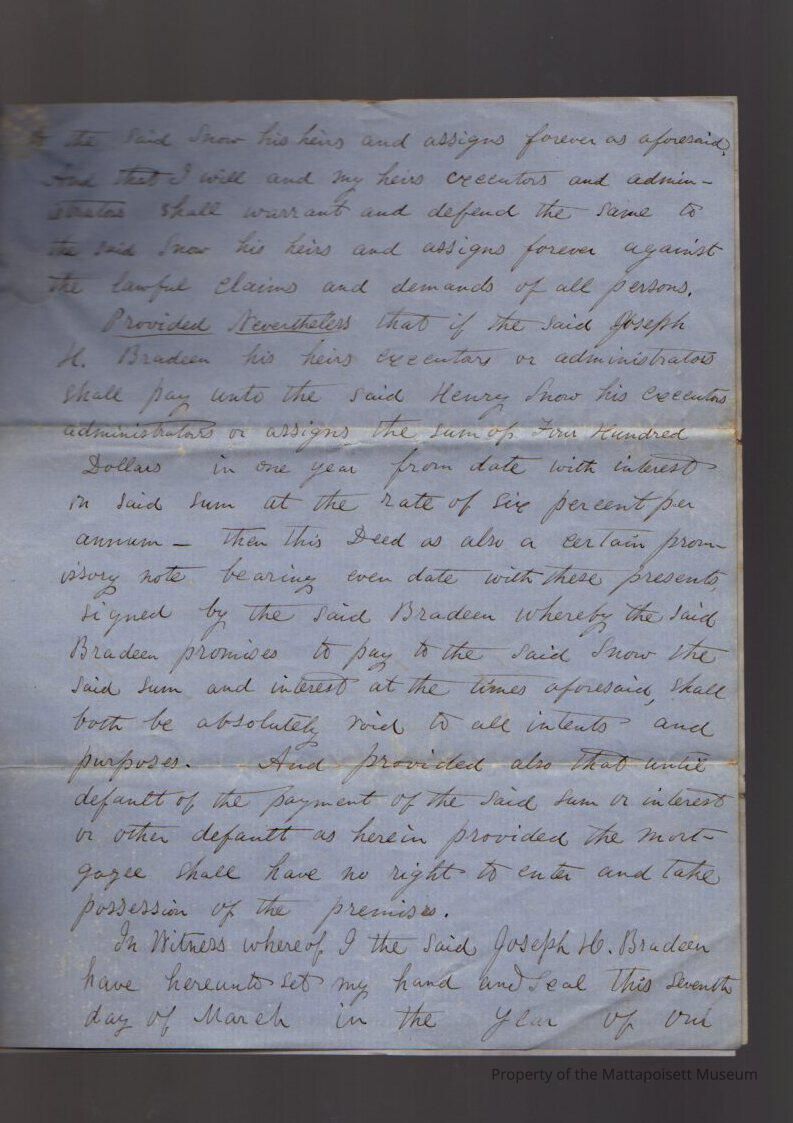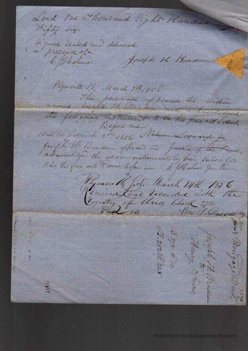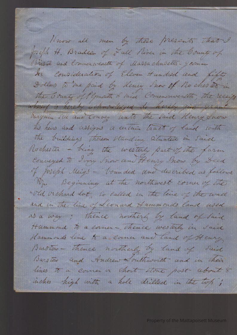 Joseph H. Bradeen of Fairhaven to Henry & Polly Snow, land for $1,150.Collection