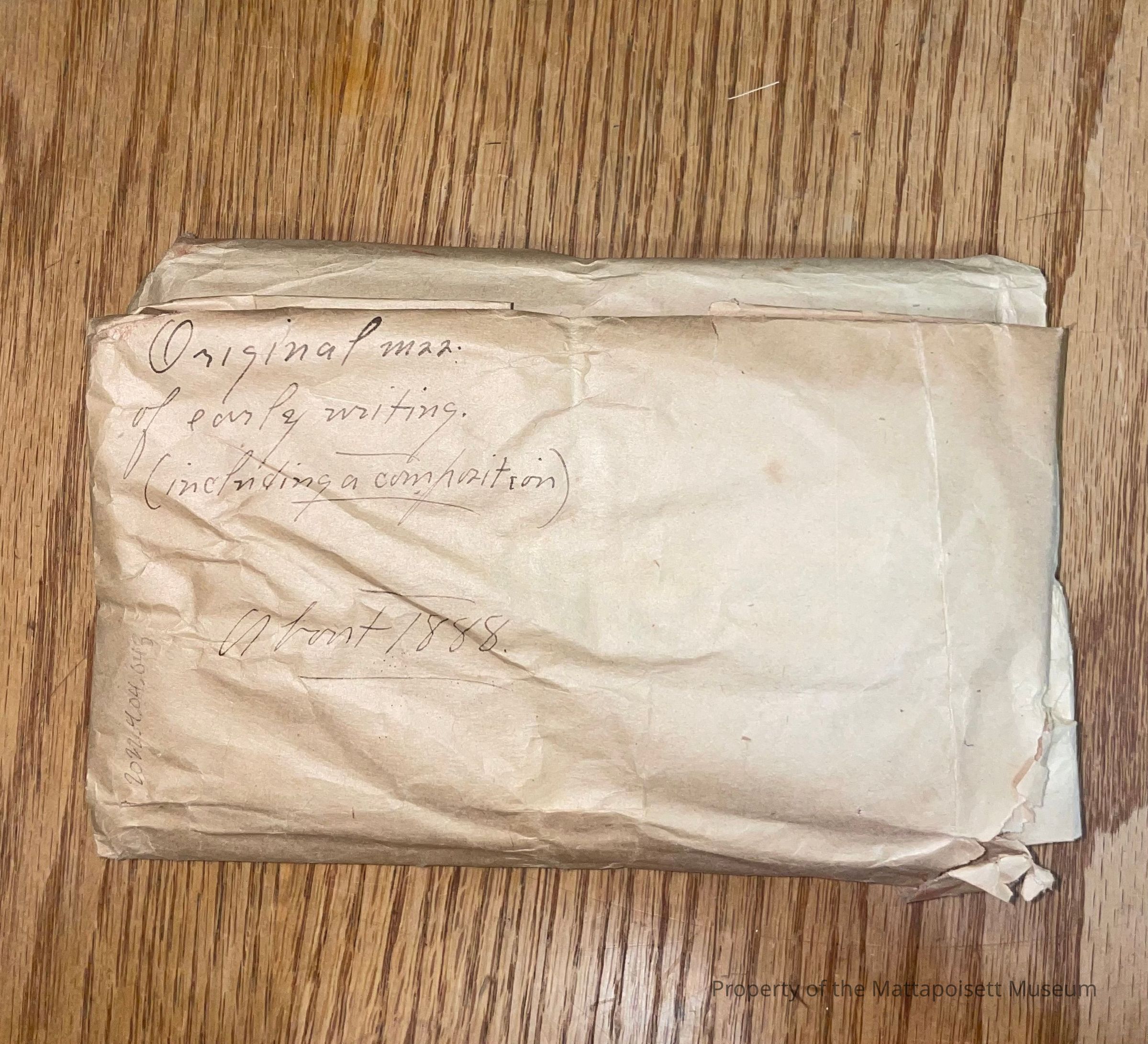 George W. Harrington Collection - Manuscripts: A stack of handwritten manuscripts wrapped in paper. The label on the paper says "Original mss. of early writing. (including a composition) About 1888."