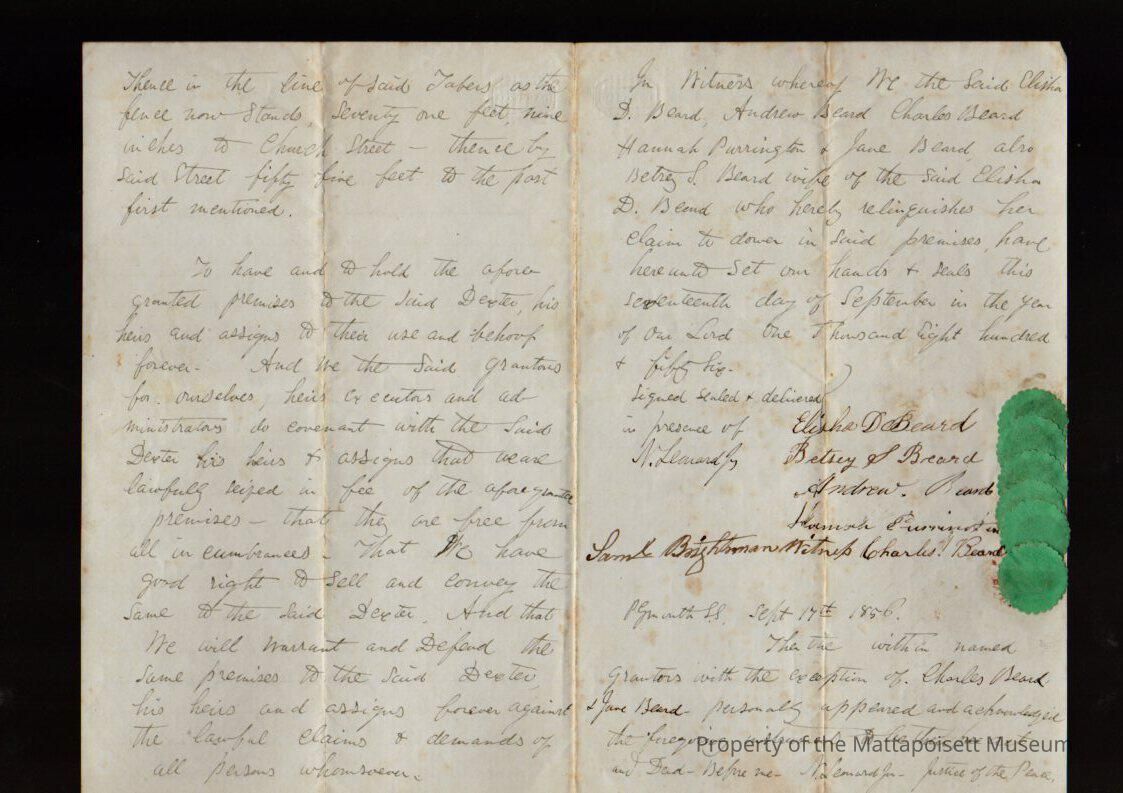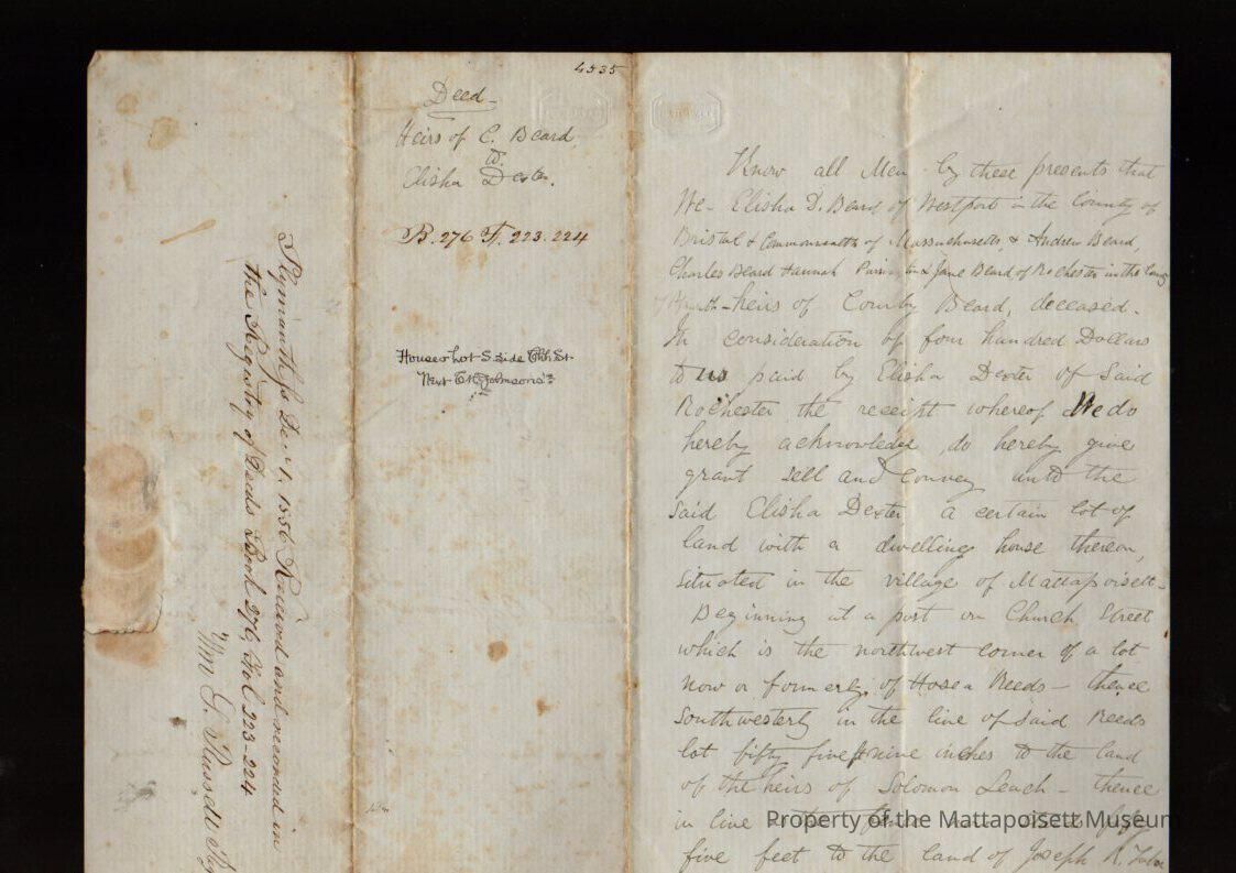 Elisha & Betsey Beard, Andrew, Charles & Jane Beard, Hannah Purrington, heirs of Courby Beard to Elisha Dexter, land in southeast Mattapoisett Village on Church Street for $400.Collection