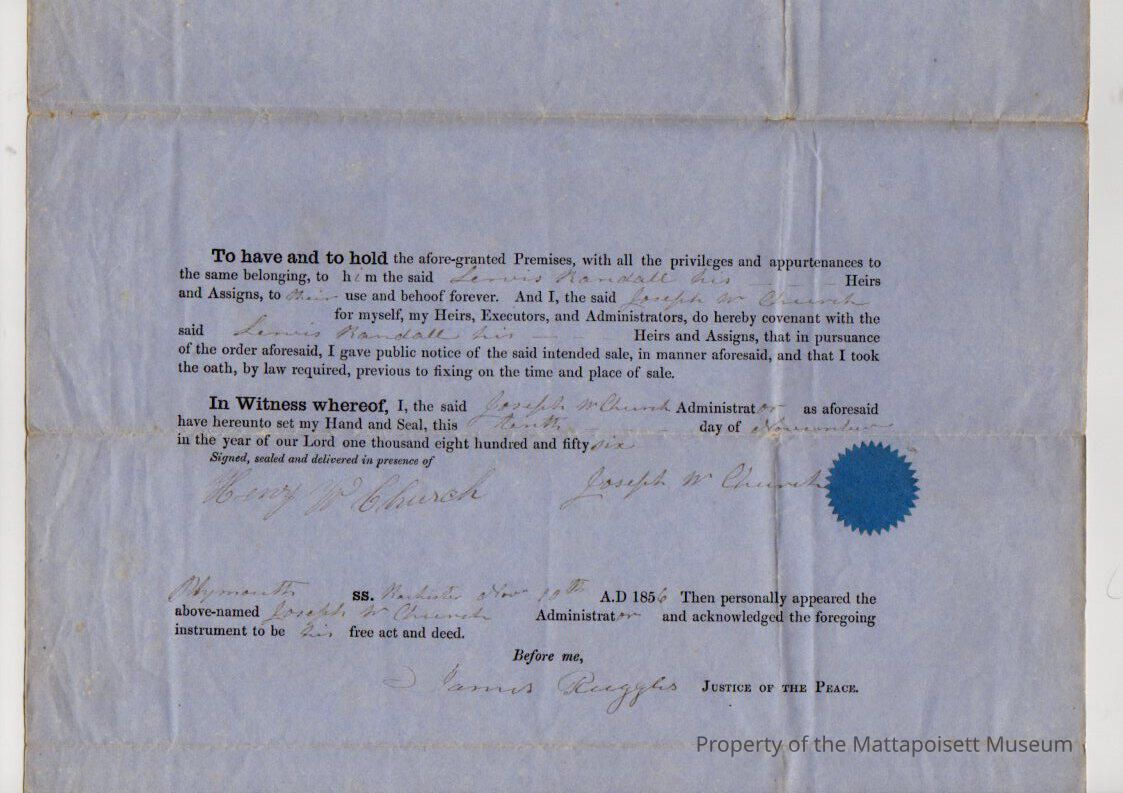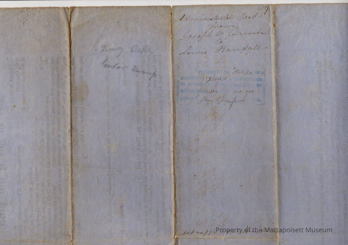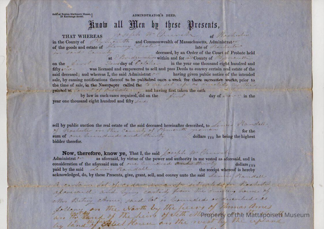 Joseph W. Church, administrator of estate of Henry Dexter to Lewis Randall, cedar swamp land for $130.Collection