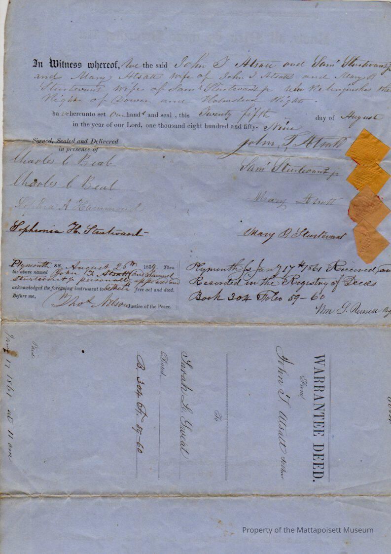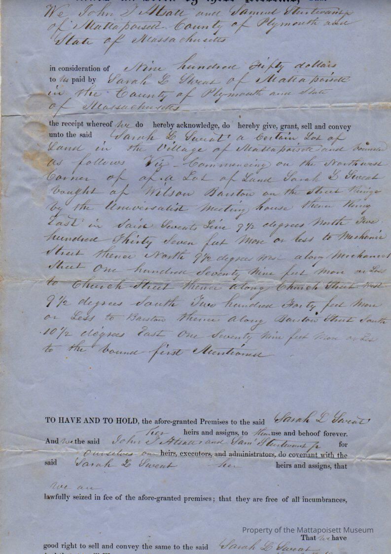 John & Mary Atsatt & Samuel & Mary B. Sturtevant to Sarah L. Sweat, land in Mattapoisett Village for $960.Collection
