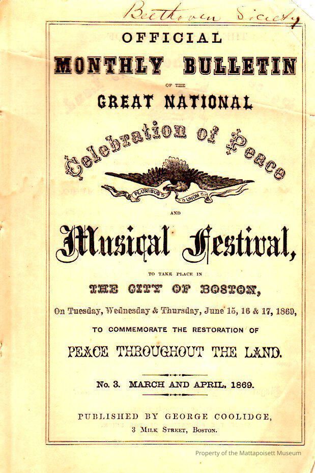 Official Monthly Bulletin of the Great National Celebration of Peace and Musical Festical. To take place in the City of Boston, on Tuesday, Wednesday and Thursday, June 15, 16 and 17, 1869 to commemorate the restoration of Peace Throughout the Land. No. 3, March and April, 1869. Published by George Coolidge, 3 Milk Street, Boston. Beethoven Society written along top.Acquisition