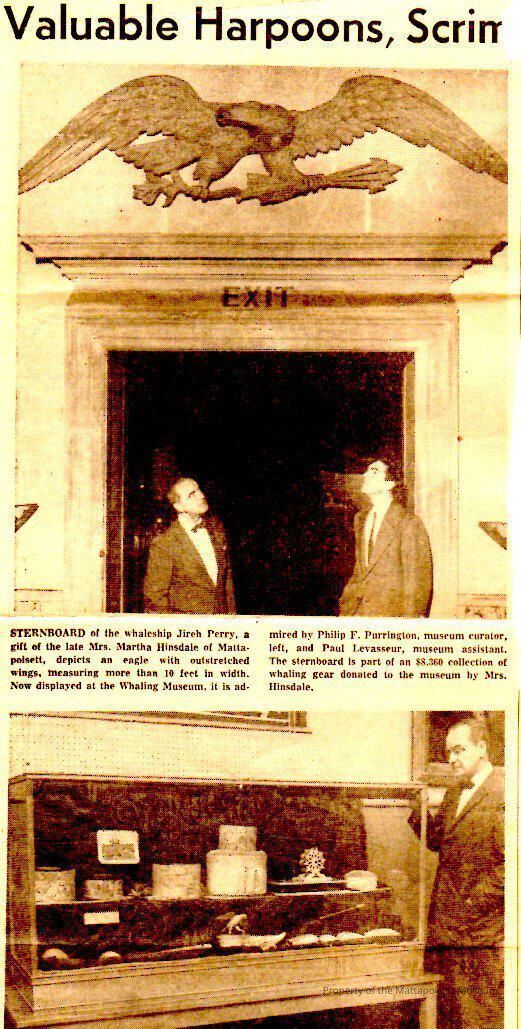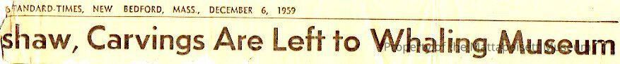 Valuable harpoons, scrimshaw, carvings are left to Whaling Museum newspaper clipping from Sunday Standard-Times, December 6, 1959. Several photographs. Article detailing donation from Mrs. F. Gilbert Hinsdale of Mattapoisett to the New Bedford Whaling Museum of husband's collection of harpoons, scrimshaw and other items related to whaling.Acquisition