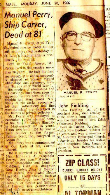 Obituary from The Standard-Times New Bedford, Mass. Monday, June 20, 1966. Manuel Perry, Ship Carver, Dead at 81. "Mr. Perry was employed as caretaker at the summer home of the late F. Gilbert Hindsale in Mattapoisett for 25 years."Acquisition