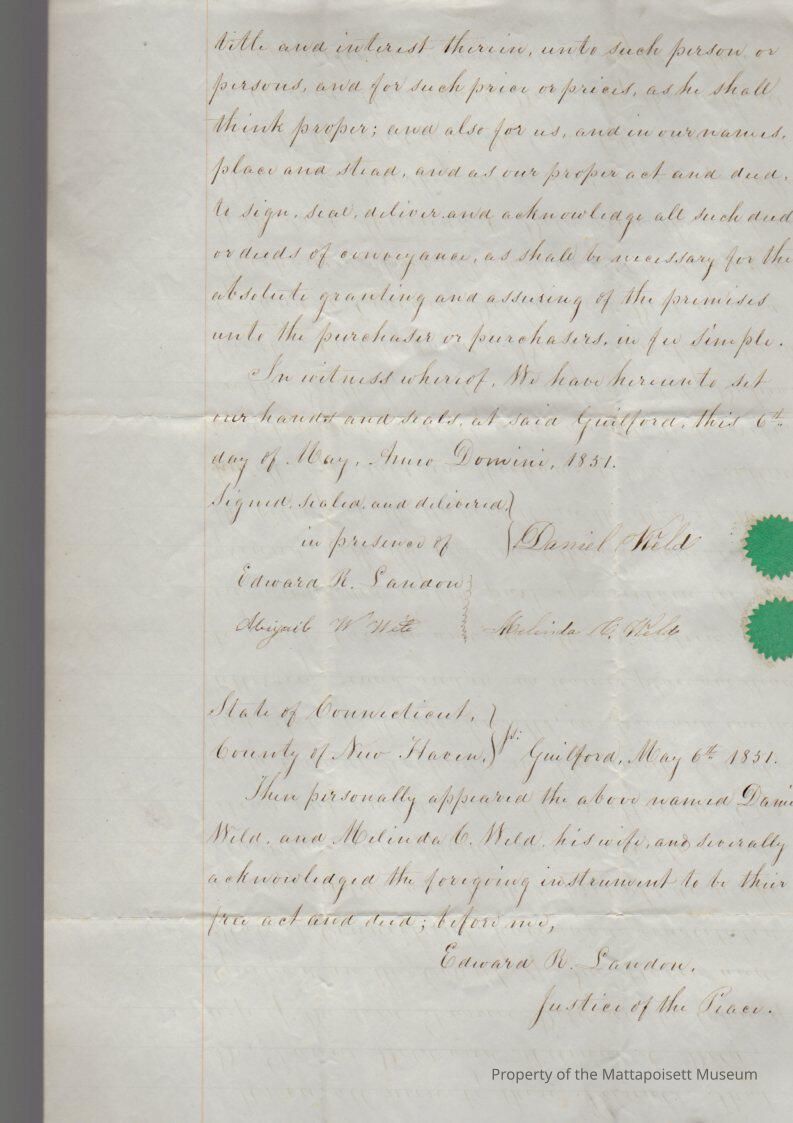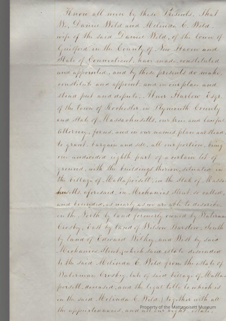 Daniel & Melinda Weld of New Haven CT, giving Power of Attorney, to Abner Harlow for sale of 1/8th part of lot with buildings in Mattapoisett Village on Mechanic Street.Collection