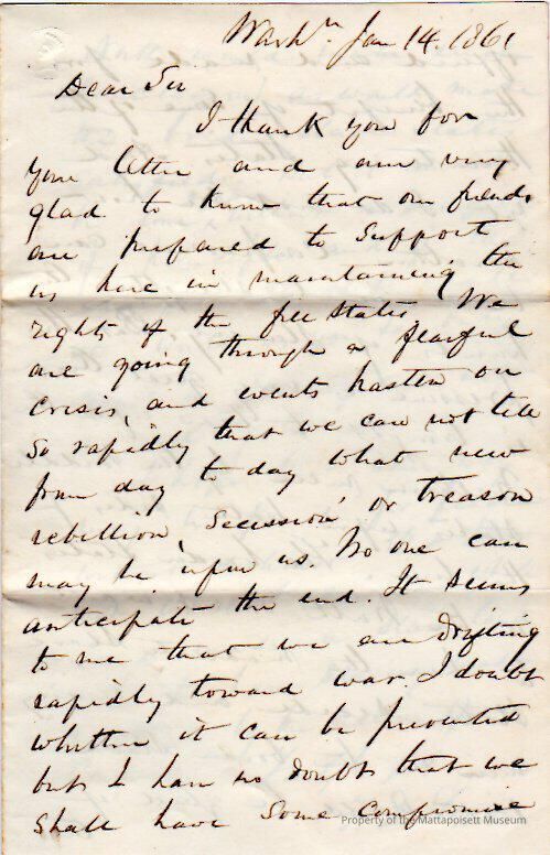 Letter from T. D. Eliot to Alma Harlow, Esq, Mattapoisett, Mass. Includes envelope.Collection