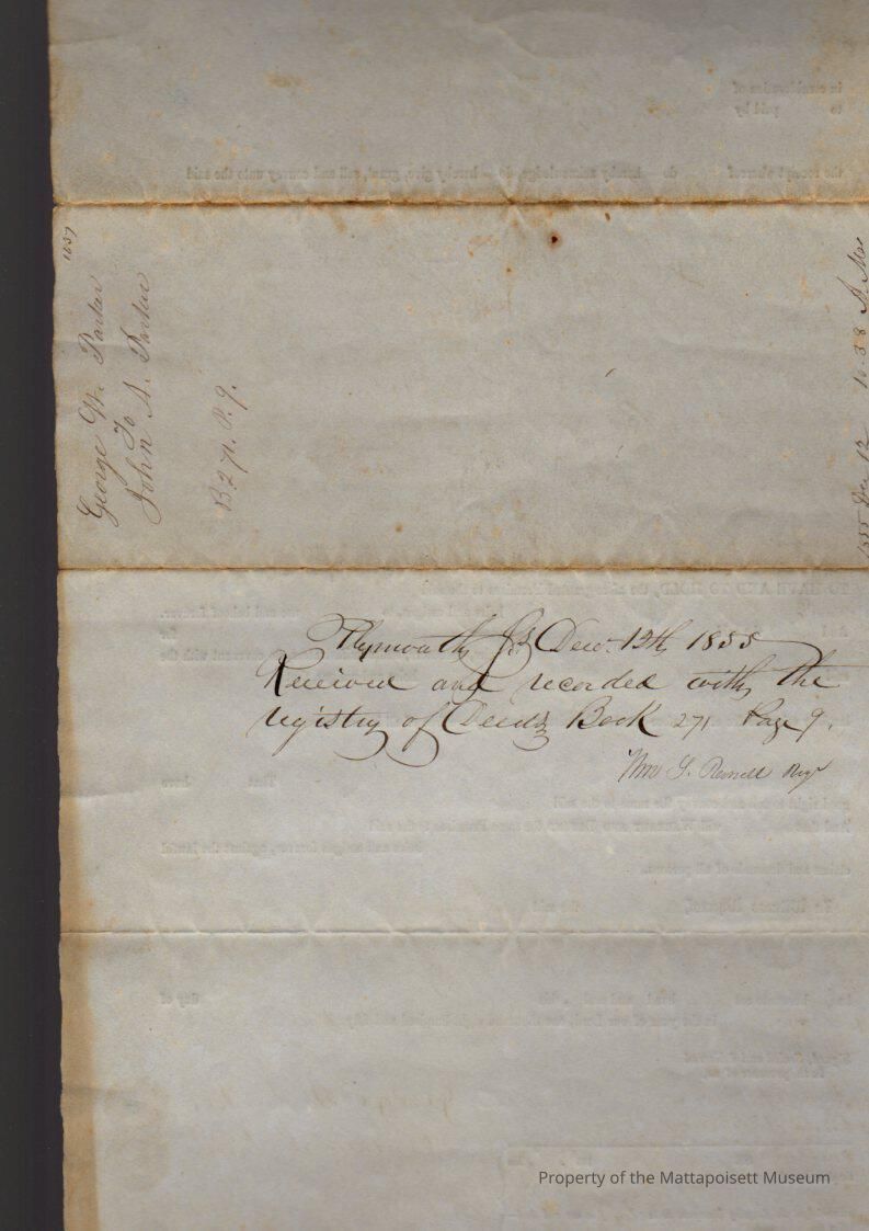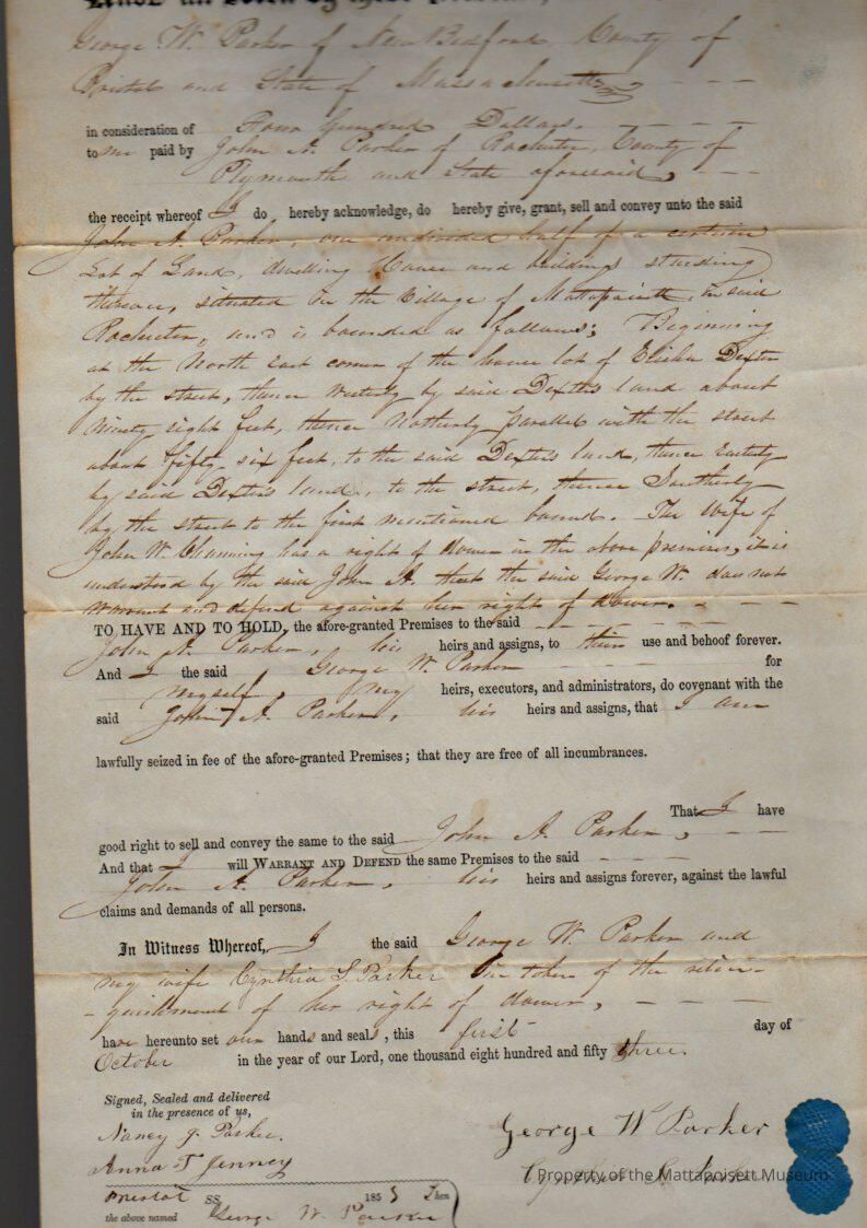 George W. & Cynthia S. Parker to John A. Parker, ½ lot land and dwelling house and buildings in Mattapoisett Village for $400.Collection