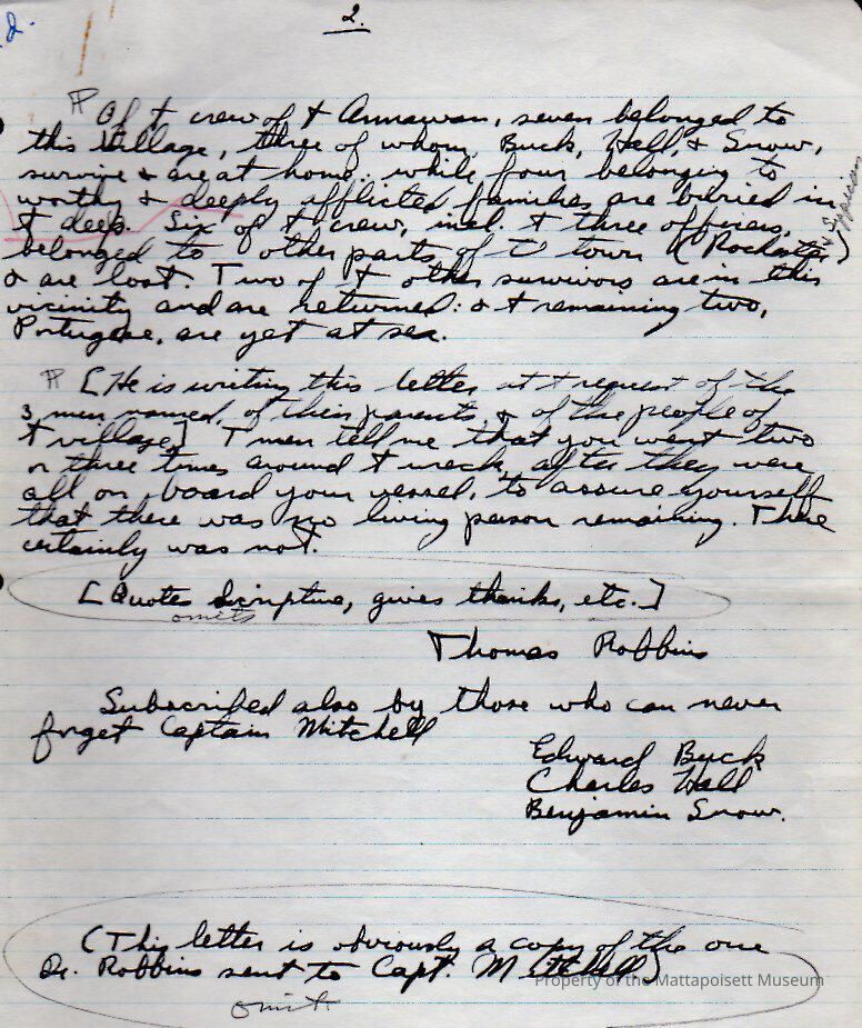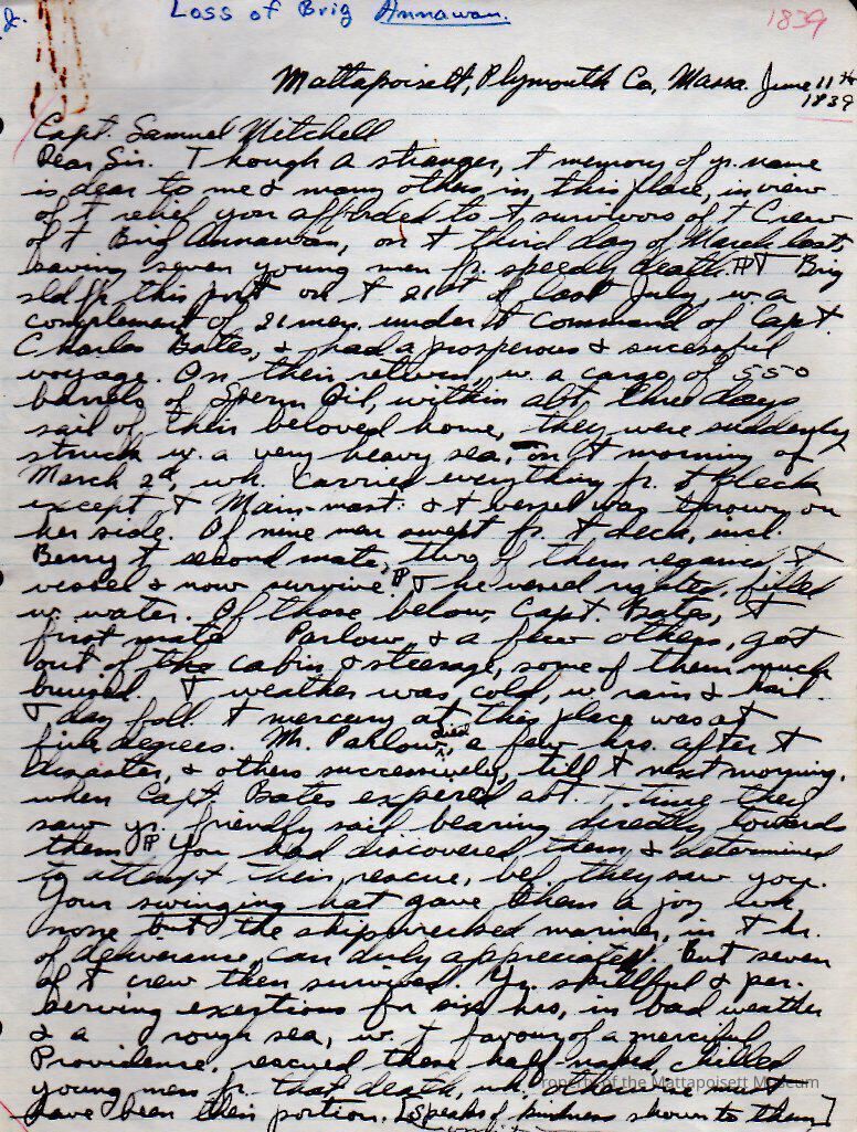 Copy of a letter of thanks sent by Thomas Robbins (Doctor) to Capt. Samuel Mitchell for rescuing remaining crew after the loss of the Brig "Annawan".Collection