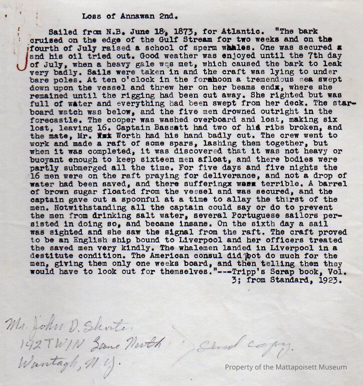 Description of the loss of Brig "Annawan II" from Tripp's scrapbook, Vol. 2 from Standard, 1923. Two typed copies.Collection
