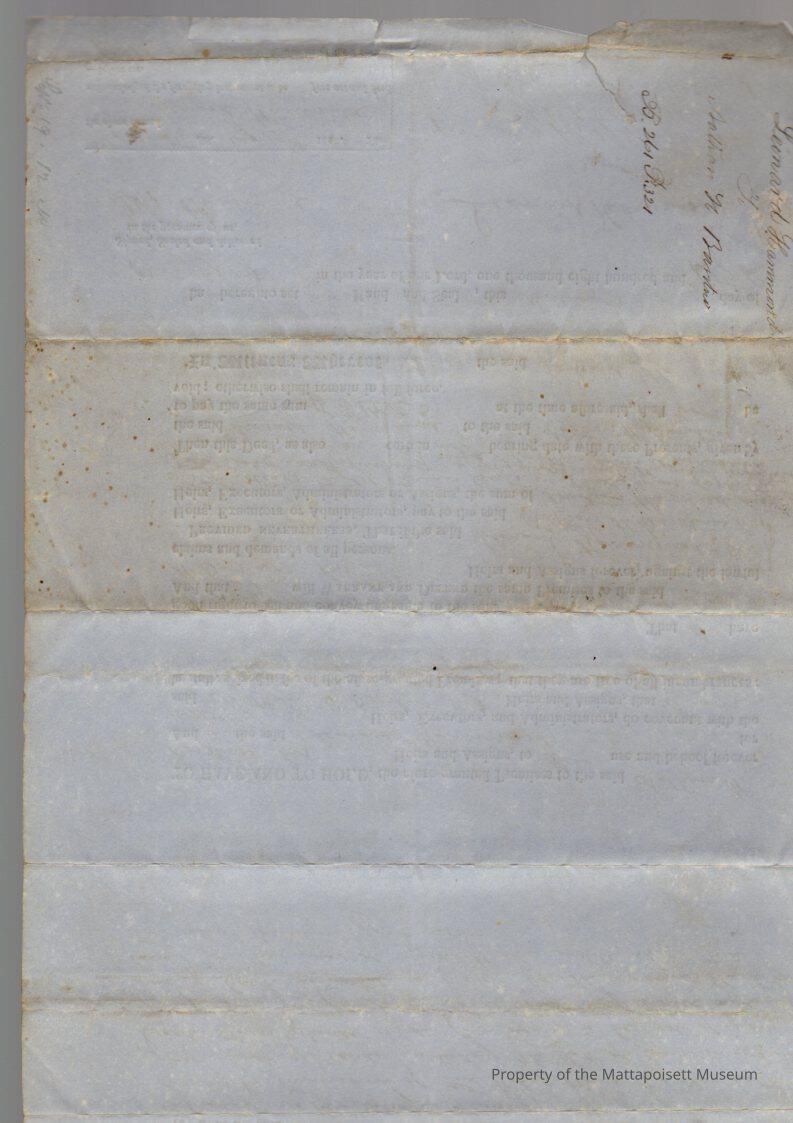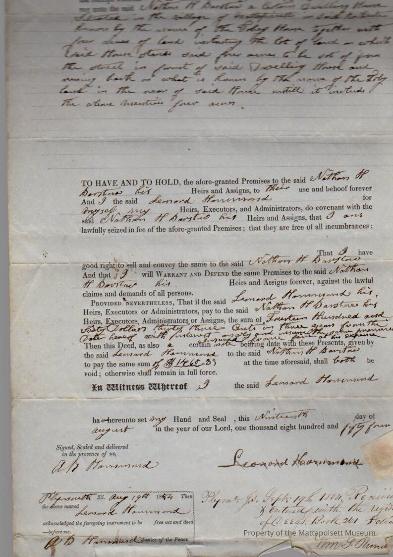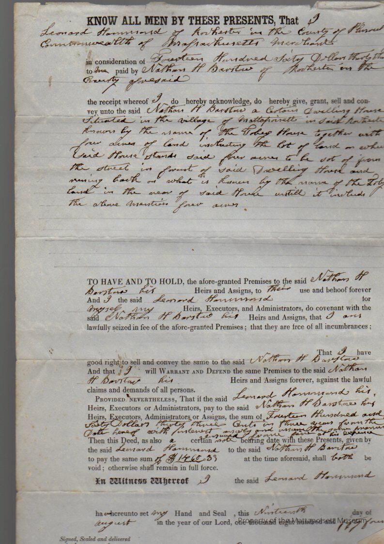 Leonard Hammond to Nathan Barstow, dwelling house in Mattapoisett Village called “Tobey House” on 4 acres for $1,460.33.Collection