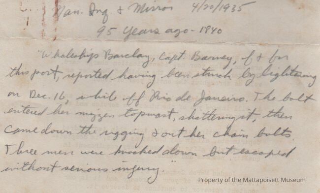 Notes from Nantucket Inquiere and Mirror (Newspaper) from 04/20/1935. Article about "Barclay" whaleship.Collection