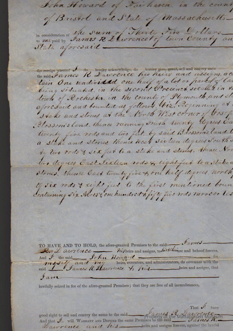 John Howard of Fairhaven to James R. Lawrence, ½ lot in the second precincnt, 6 acres, 155 rods for $35.Collection