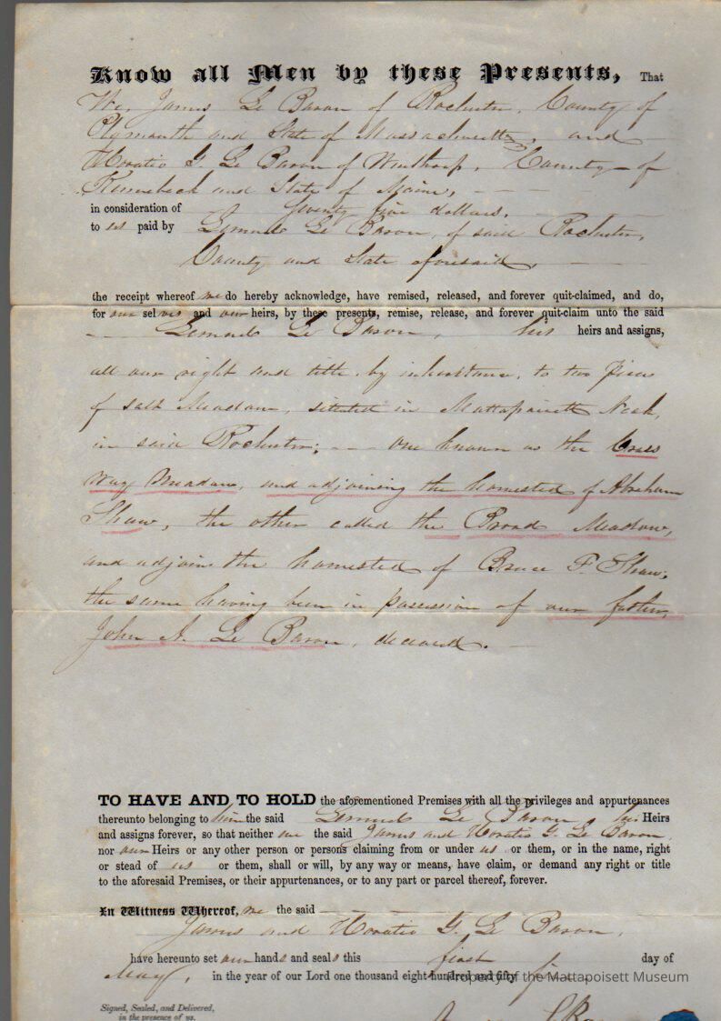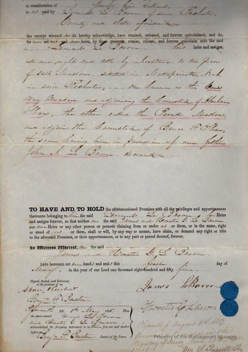 James & Horation G. LeBaron to Lemuel LeBaron, salt meadow, by inheritance, on Mattapoisett Neck for $75.Collection
