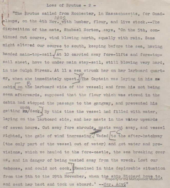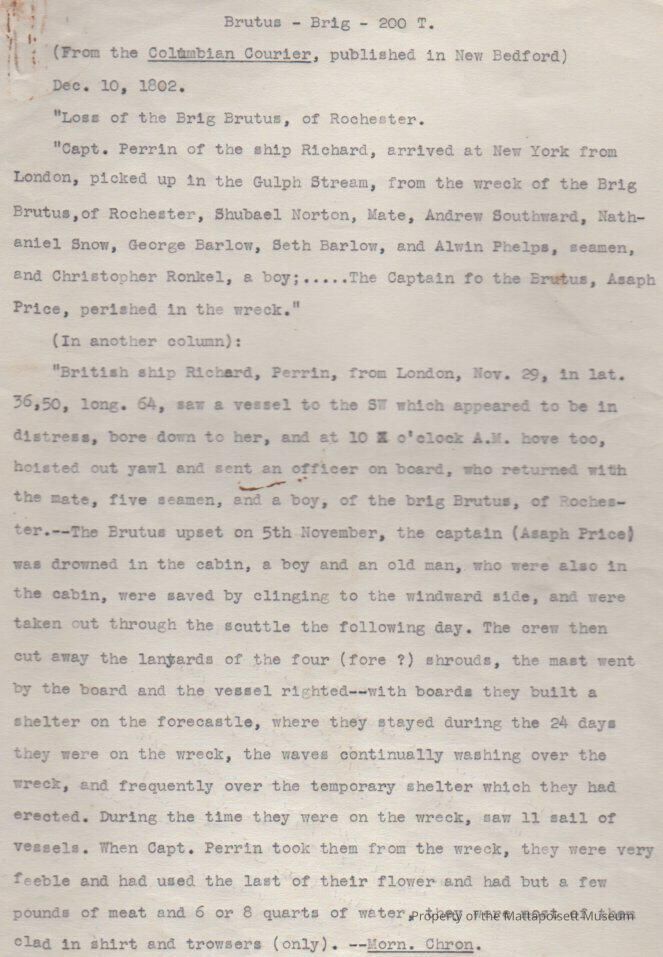 Articles on loss of Brig "Brutus" of Rochester, MA. First from the Columbian Courier, published in New Bedford, December 10, 1802Collection