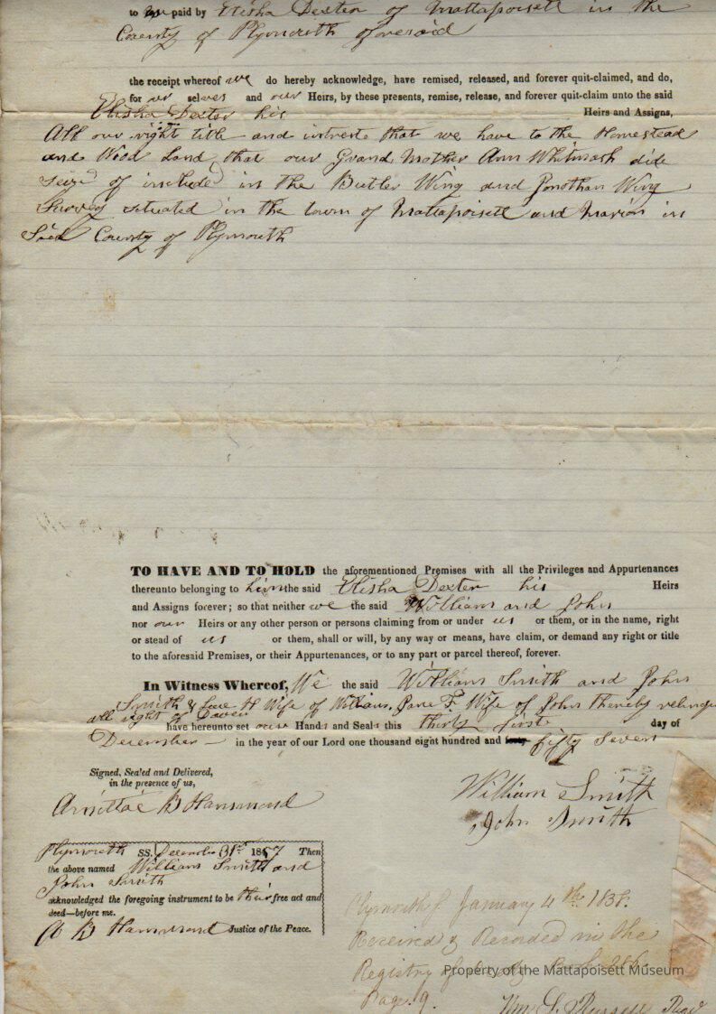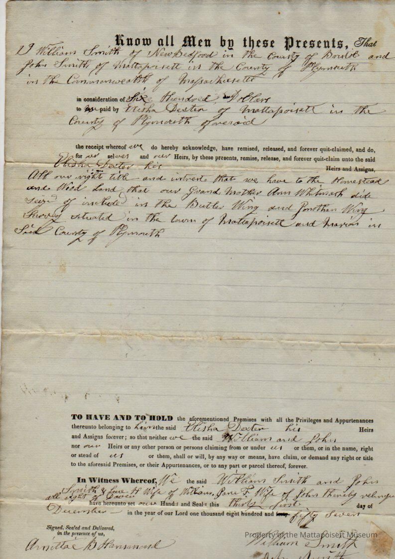 William Smith & John Smith and wives to Elisha Dexter, homestead & woodland in Mattapoisett and Marion of grandmother, Ann Whitman.Collection