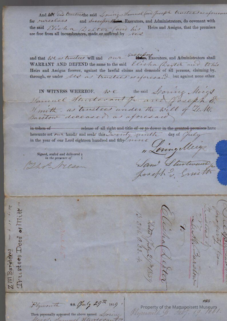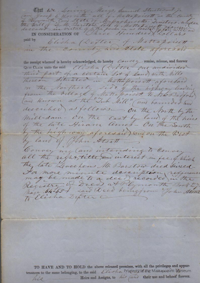 Loring Meigs, Samuel Sturtevant & Joseph E. Smith, trustees under the will of Z. M. Barstow to Elisha Dexter, 1/3 part of land with mills known as “Tub Mill” for $300.Collection